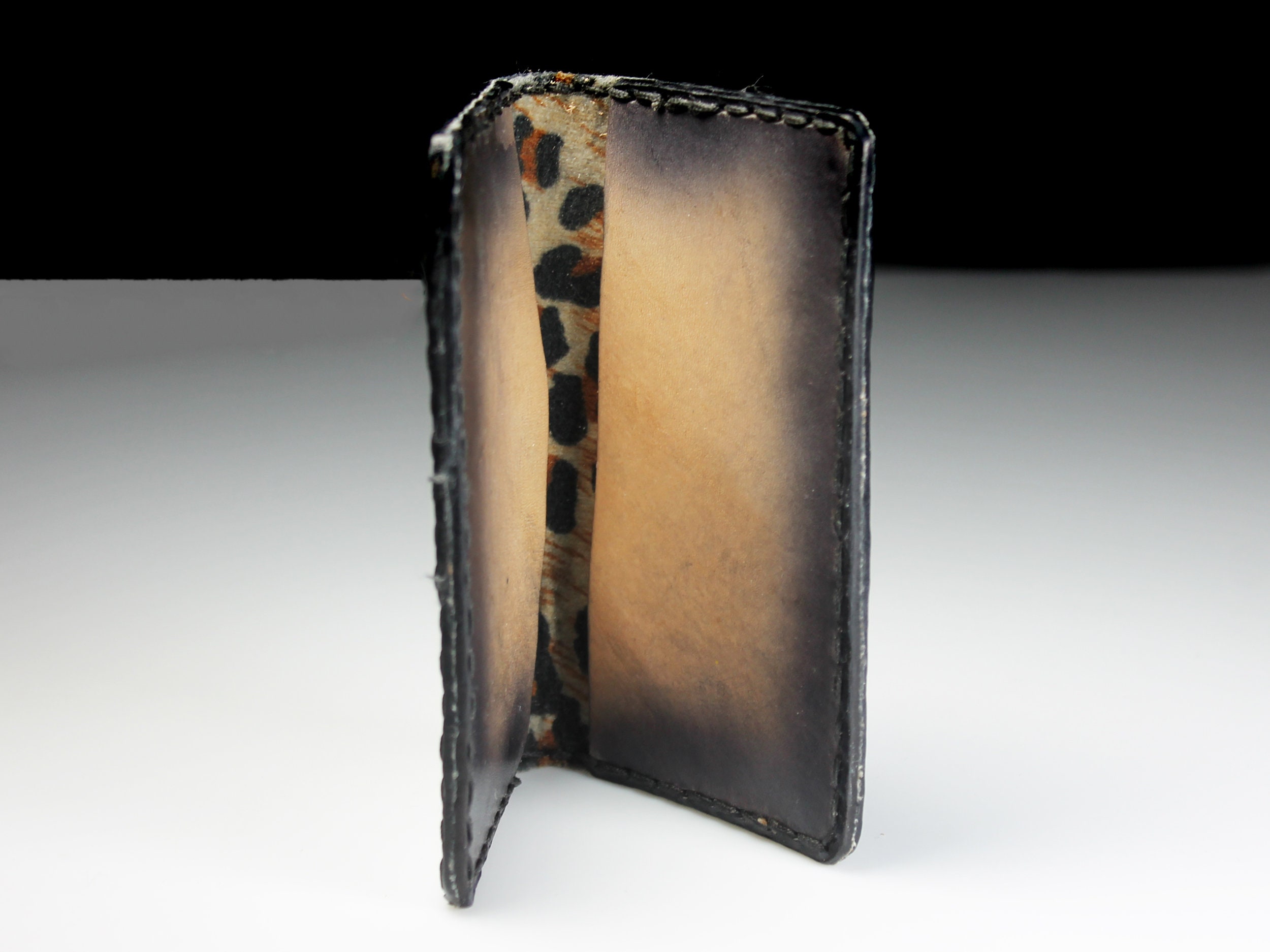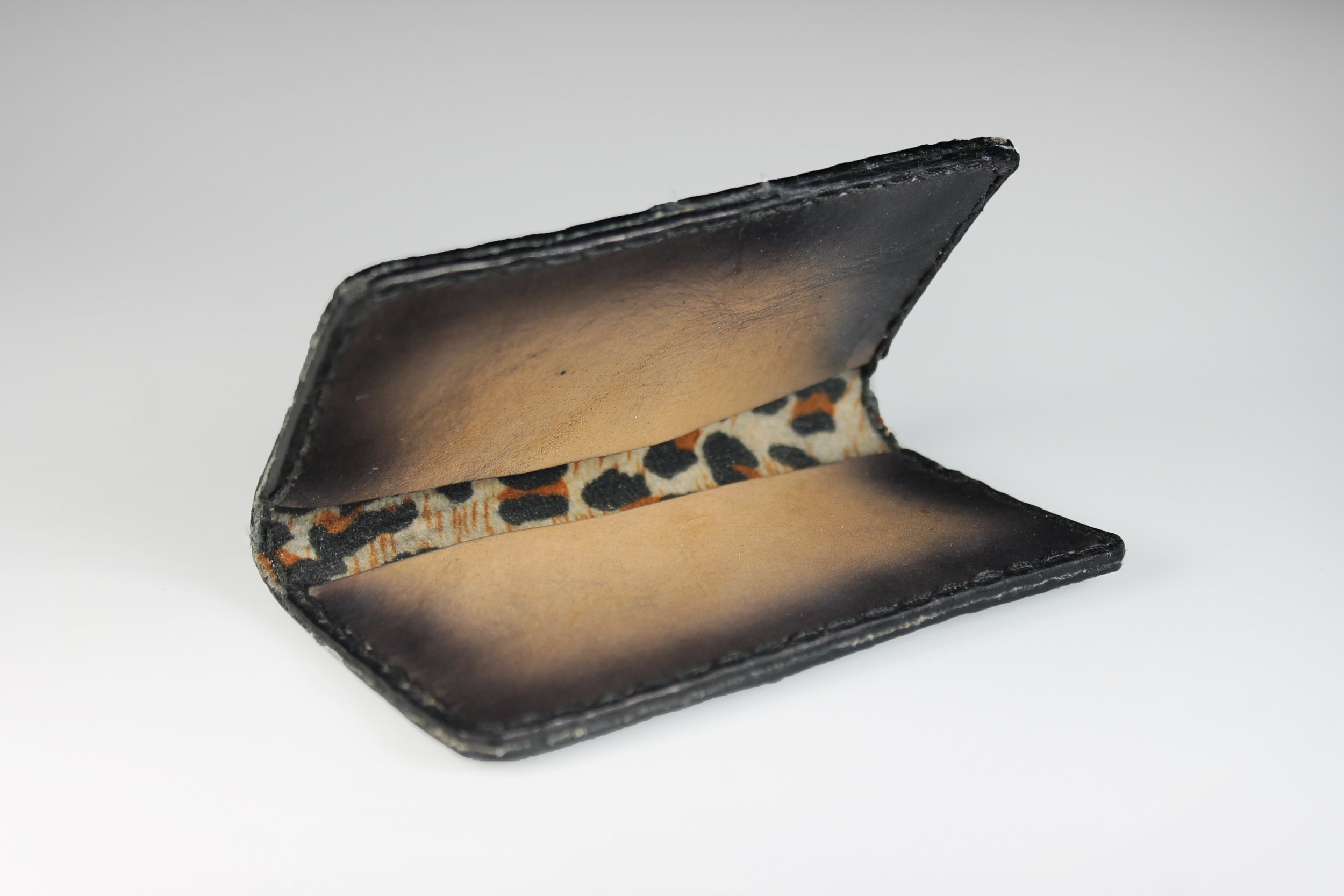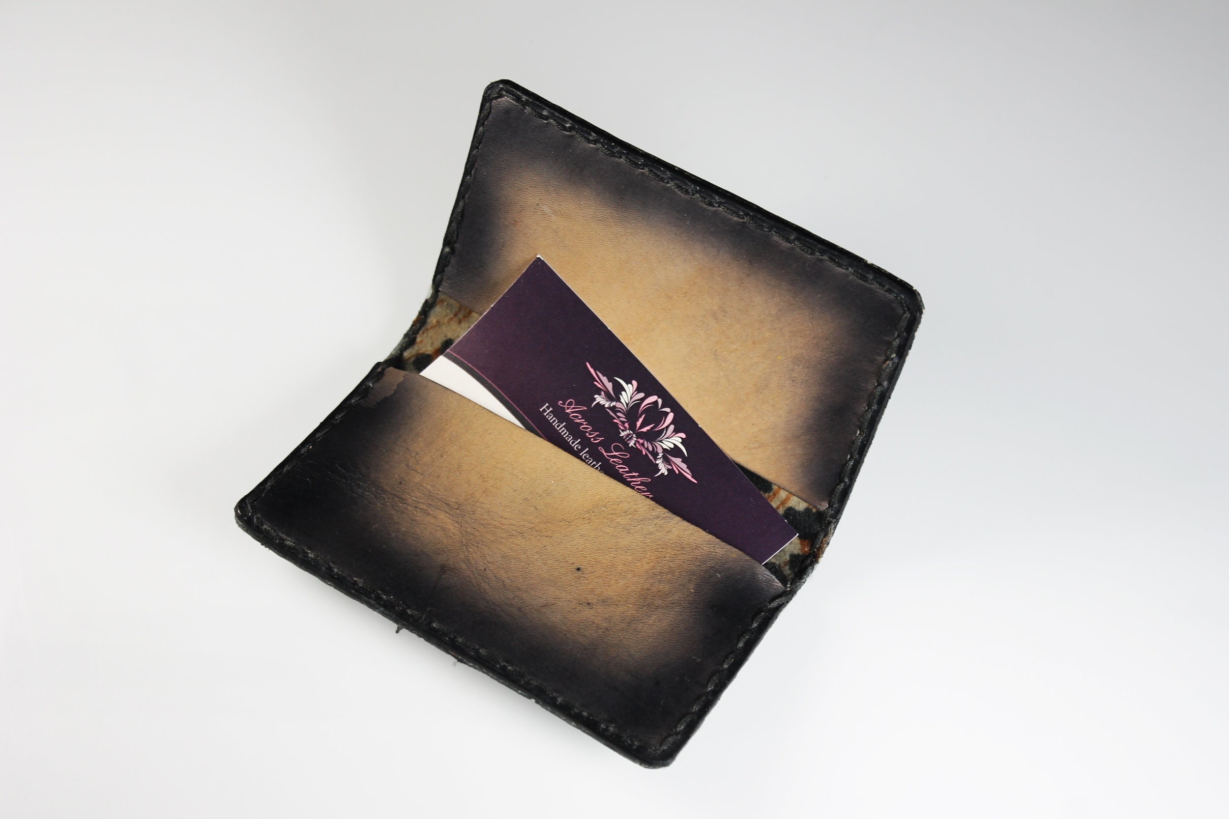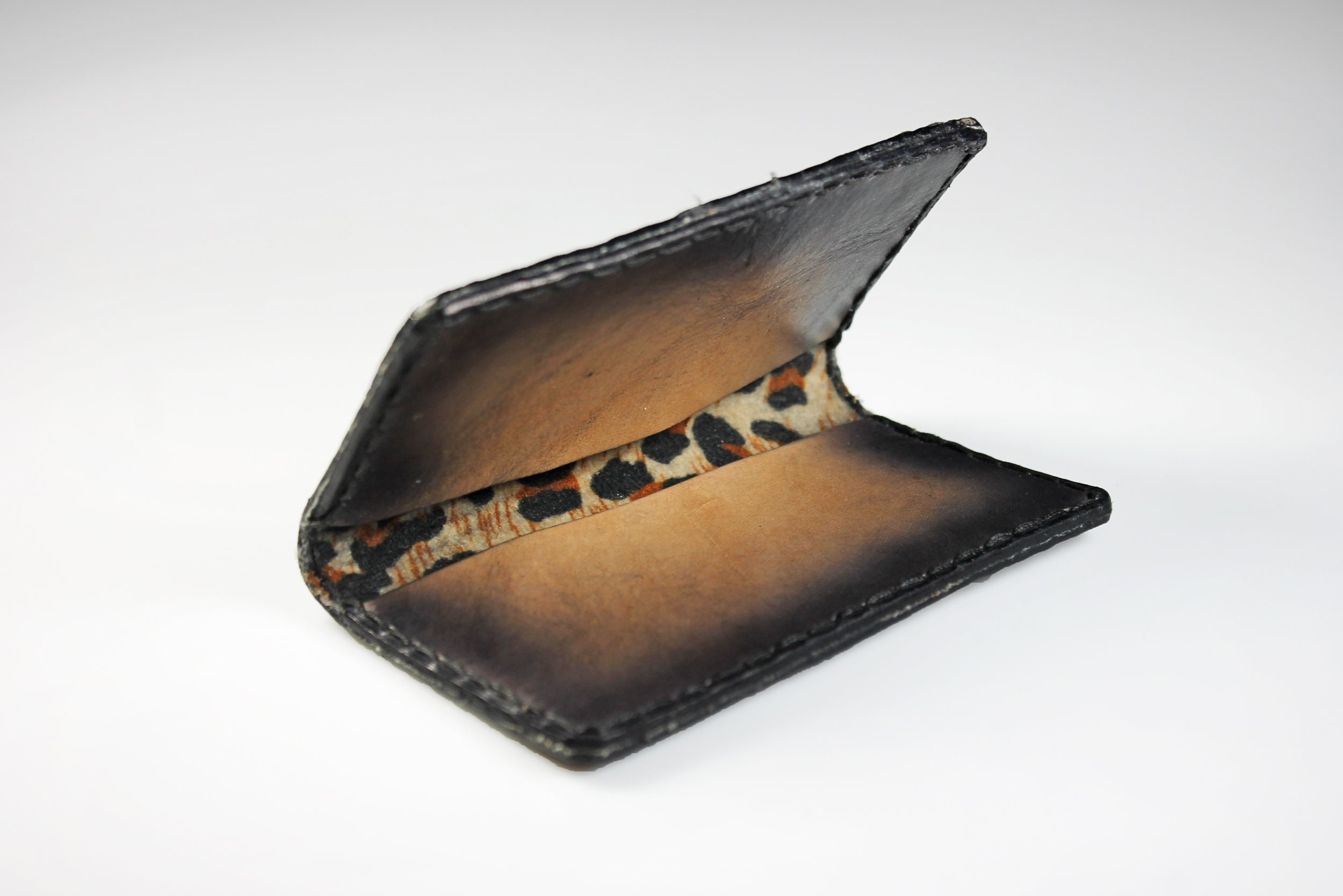 A gorgeous leather business card case. It is hand painted and completely handmade. The case holds standard 2½ inch x 3 inch cards. The case is lined with a leopard cloth on the interior. It would also made a great credit card case as well. This is a fantastic gift idea for any business person. Great way to keep cards organized.