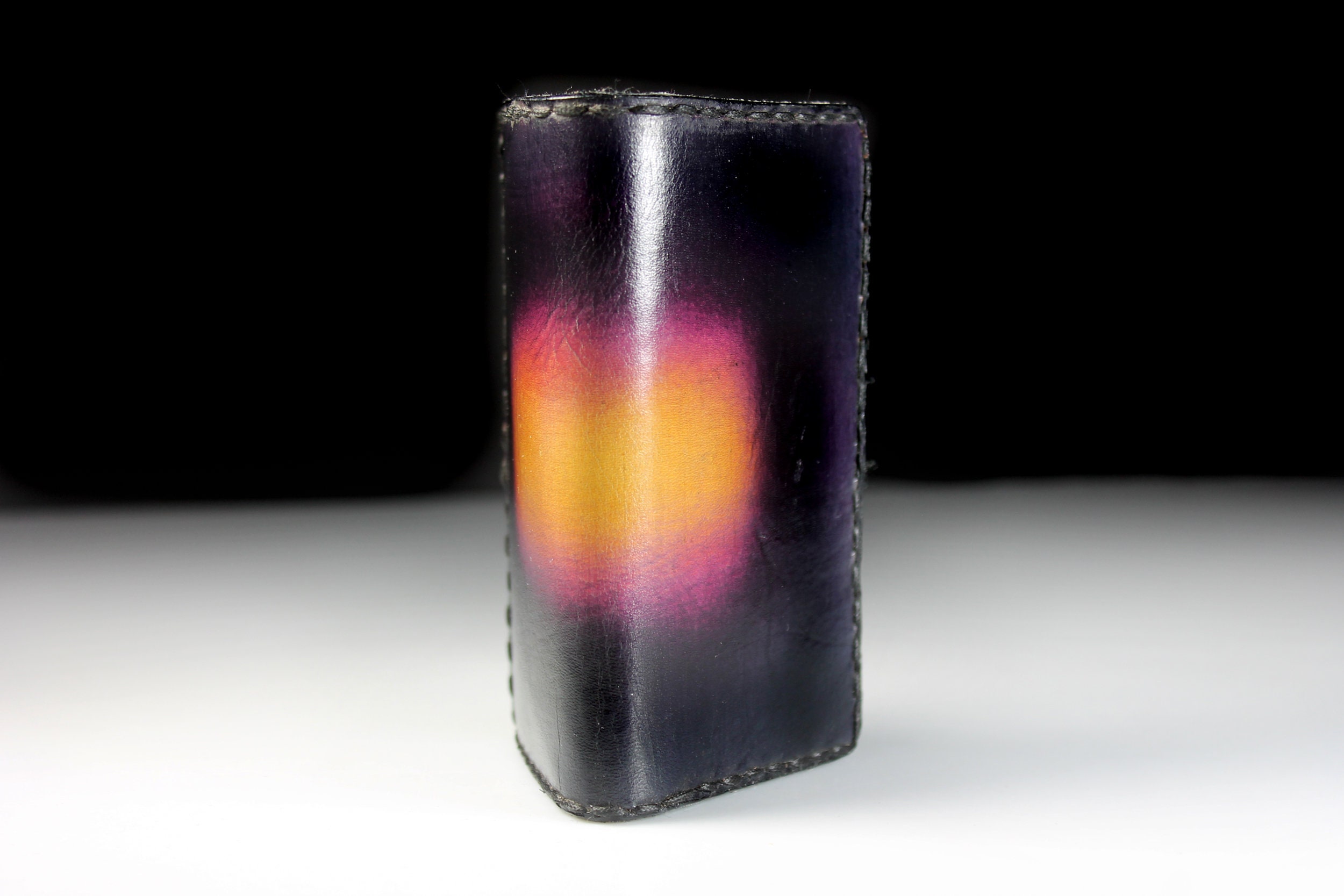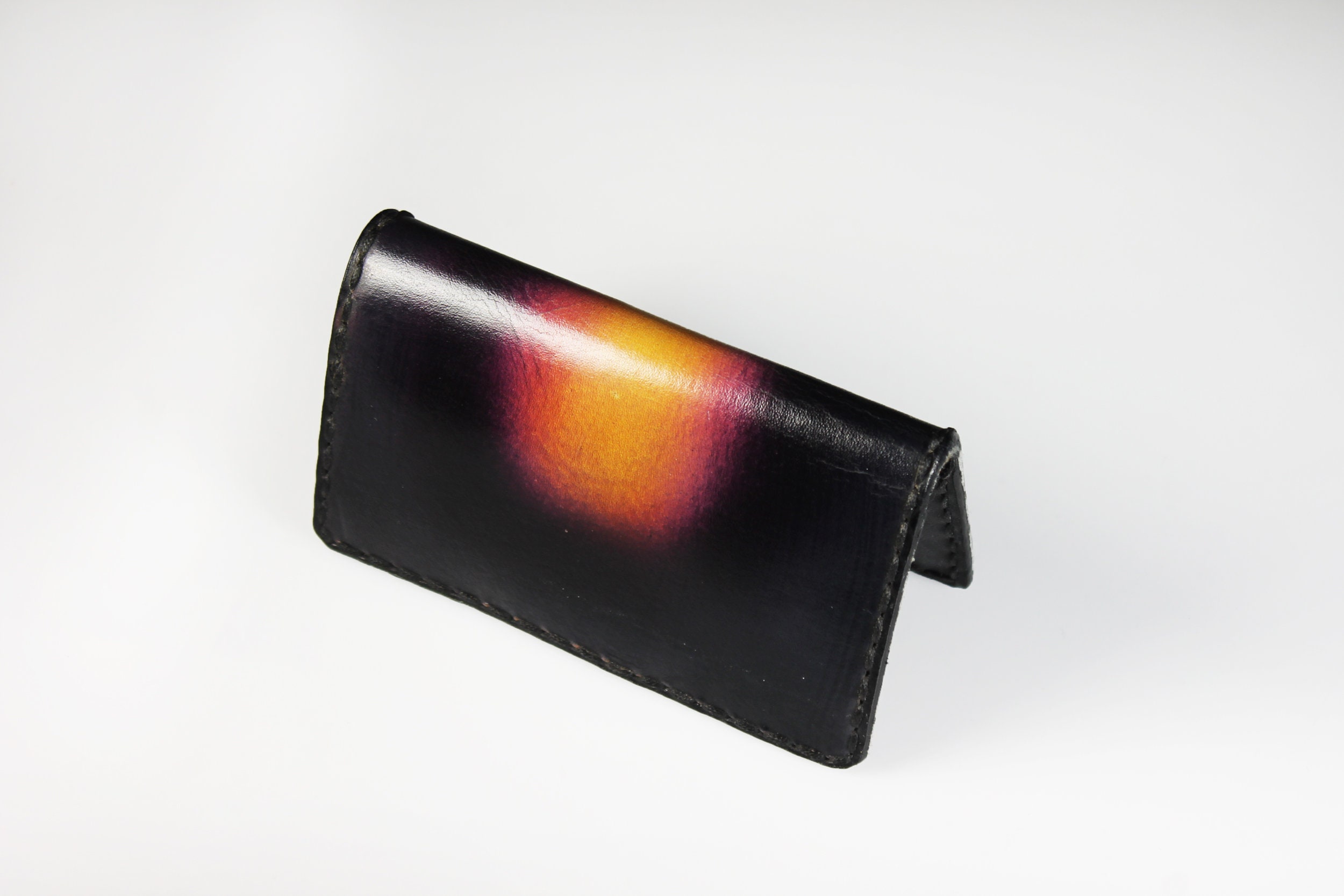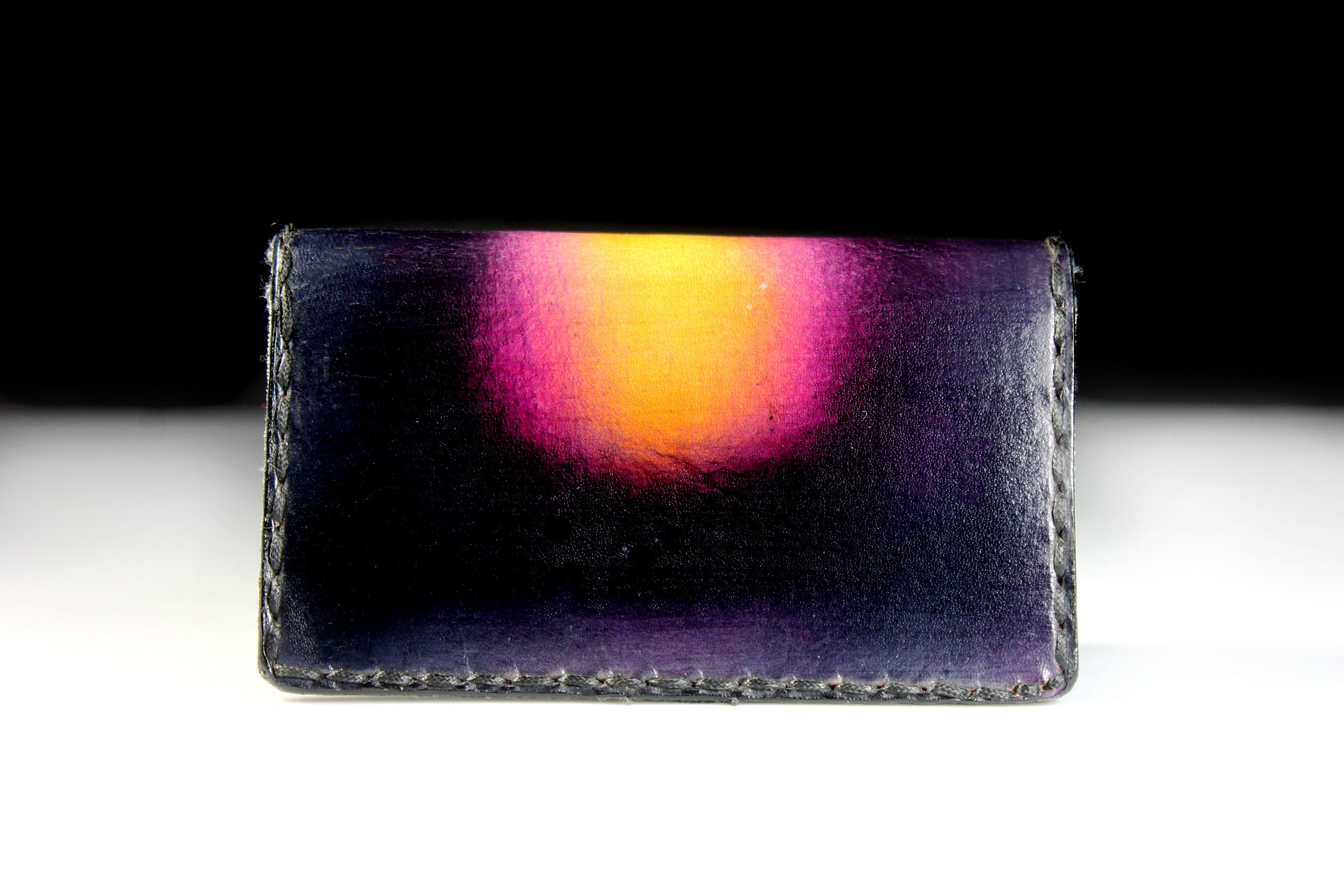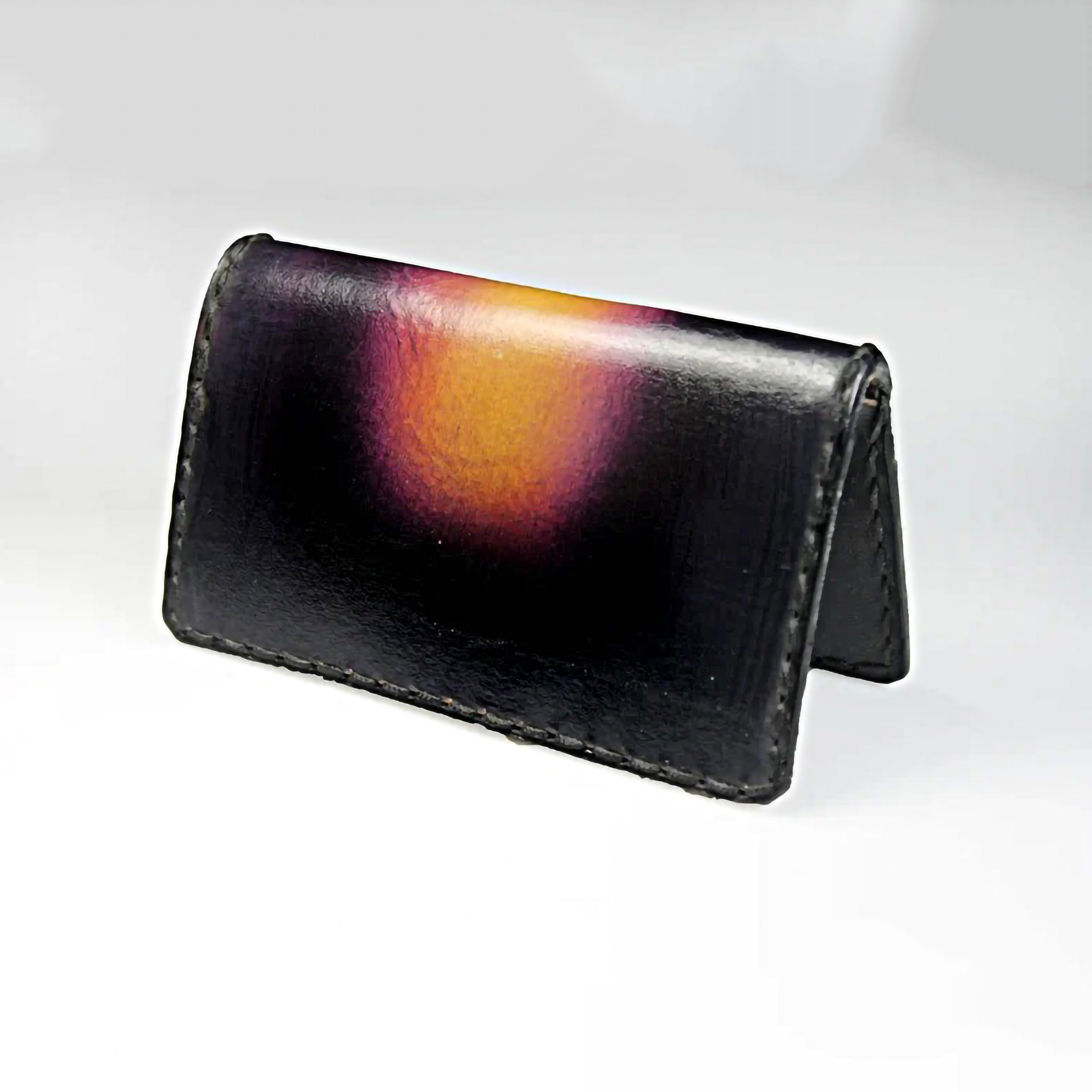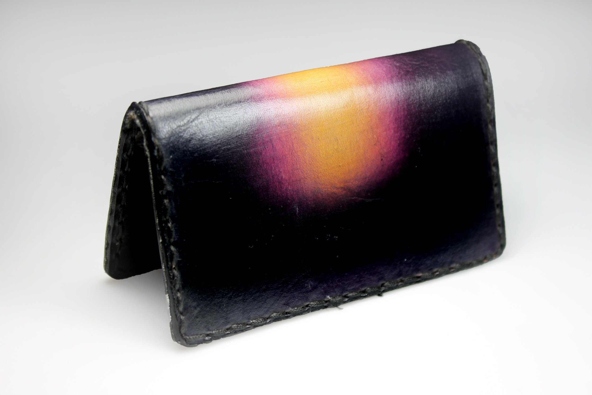 A gorgeous leather business card case. It is hand painted and completely handmade. The case holds standard 2½ inch x 3 inch cards. The case is lined with a leopard cloth on the interior. It would also made a great credit card case as well. This is a fantastic gift idea for any business person. Great way to keep cards organized.