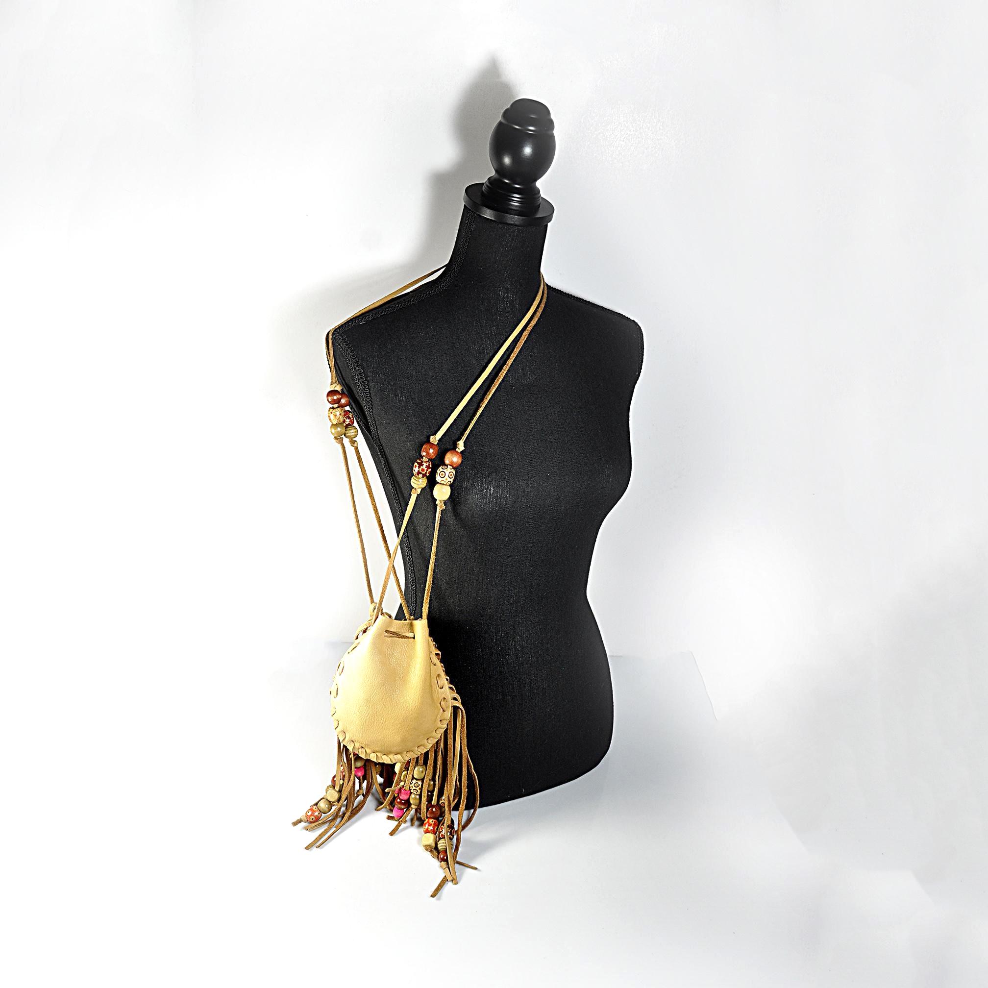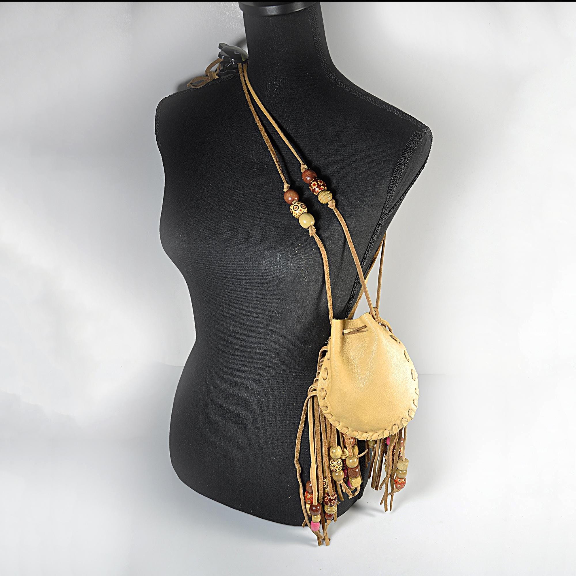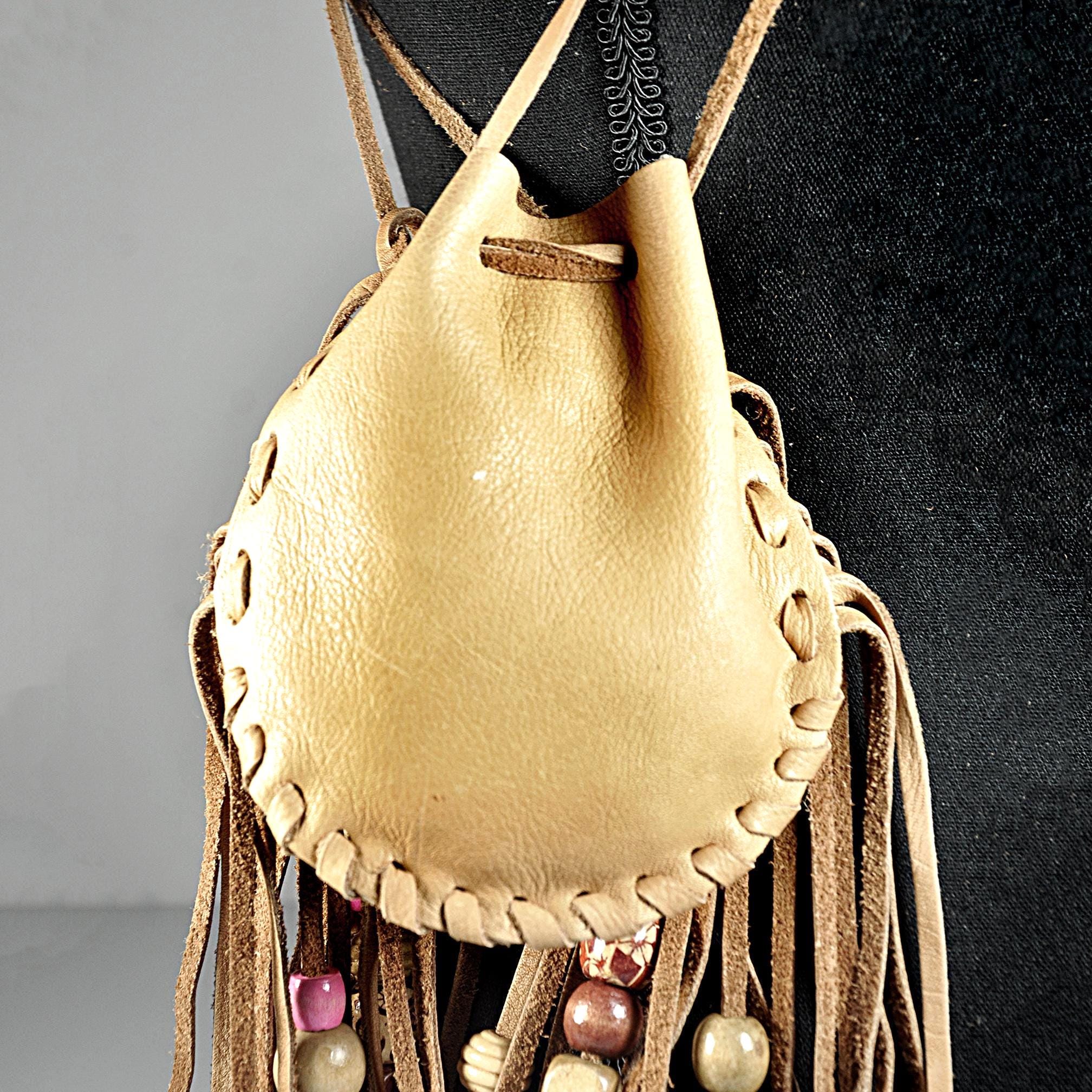 This handmade leather small crossbody bag was crafted the traditional way — by hand, not machine. The leather is extremely soft and supple, stitched together one piece at a time with care and attention to detail. No shortcuts, no factory work. The bag measures 6 inches in length by 6 inches in width, and extends to about 13 inches in total length including the hand-cut fringe. The fringe is a mixture of undecorated and decorated strands. The decorated ones have a variety of colorful beads for an extra touch of character. This is a drawstring-style bag, perfect for carrying small essentials. It can be worn crossbody, over the shoulder, or tied to a belt loop or backpack. Ideal for festivals, powwows, outdoor markets, Western wear, reenactments, or anyone who appreciates honest craftsmanship and real materials. If you believe in quality, tradition, and the value of handmade goods, this pouch was made with you in mind.
