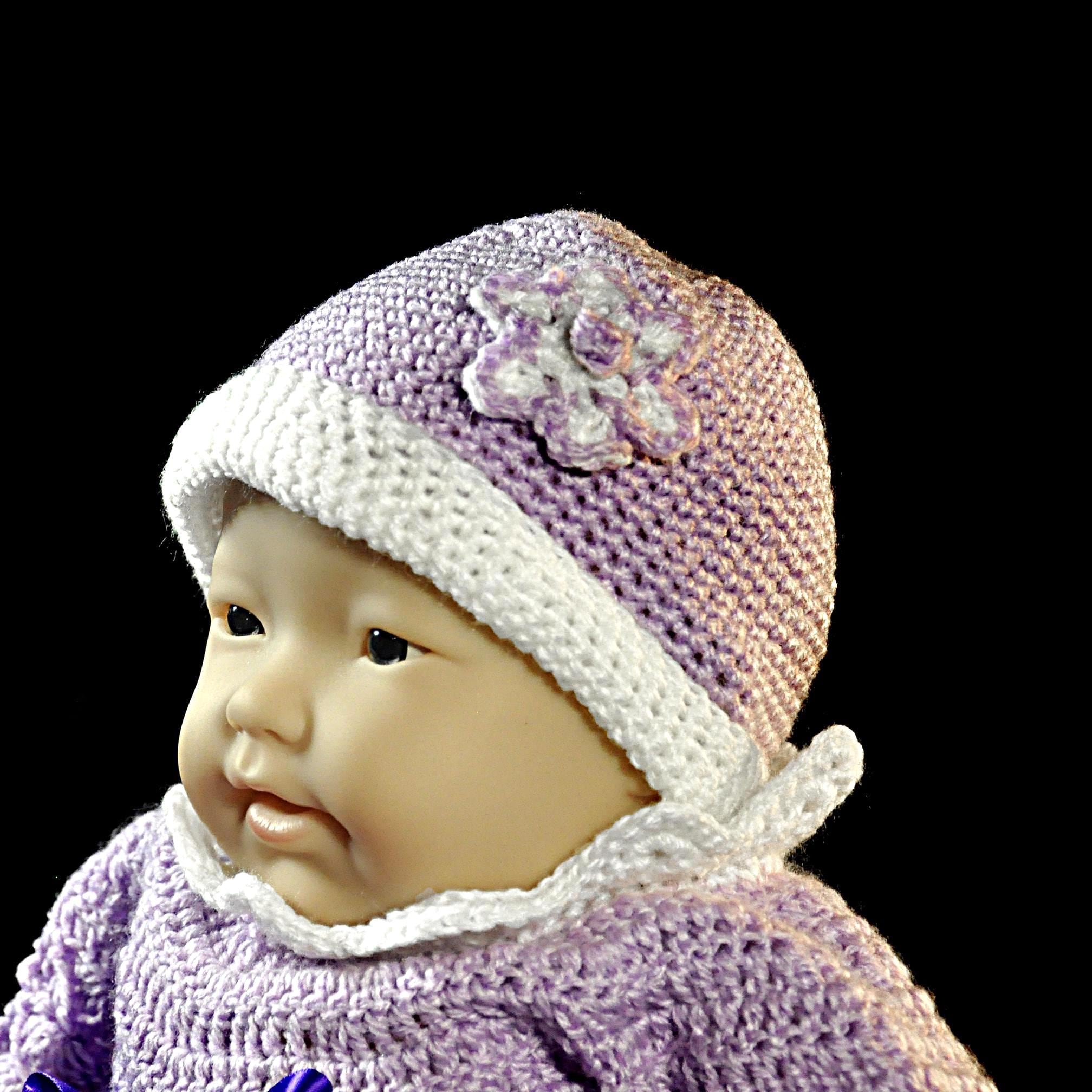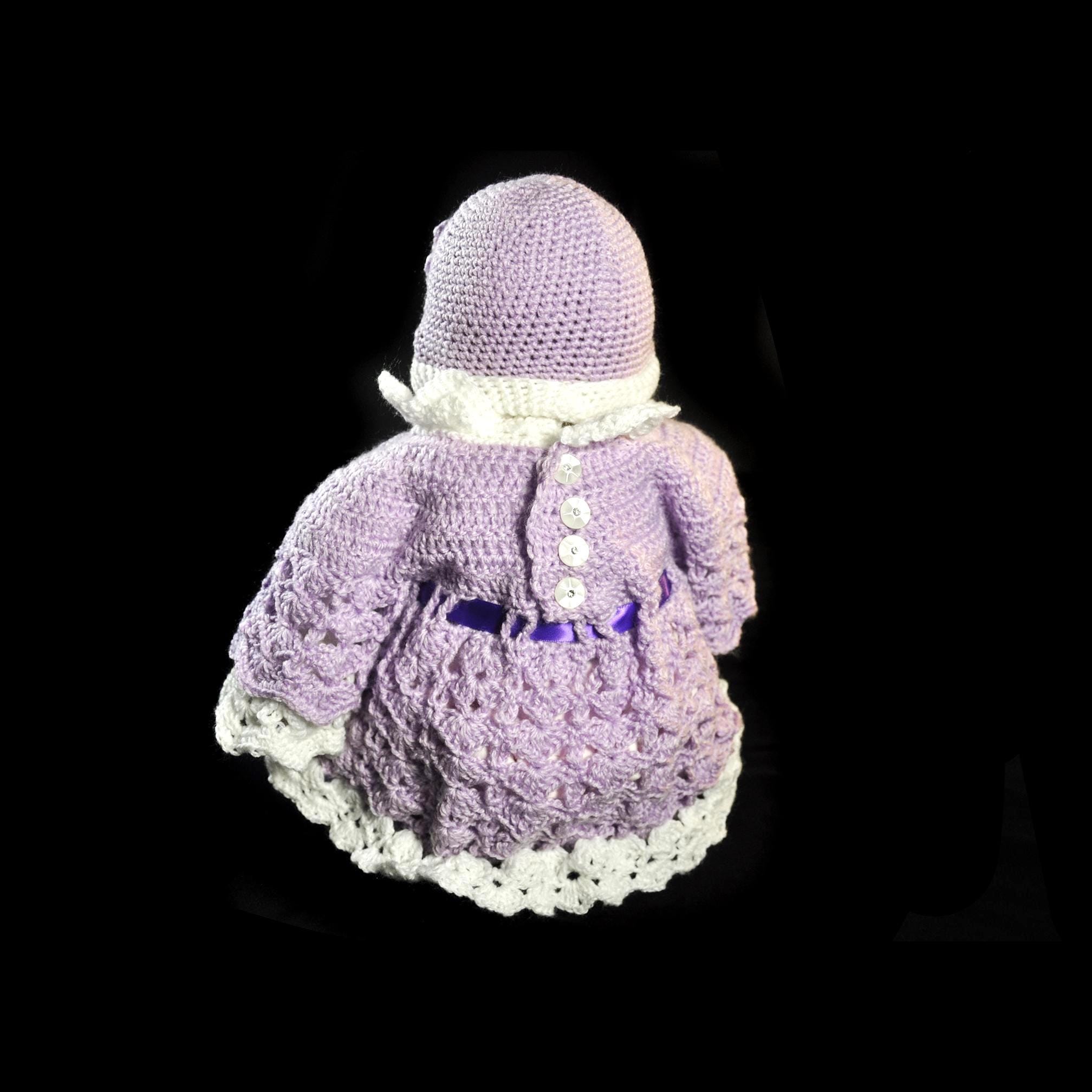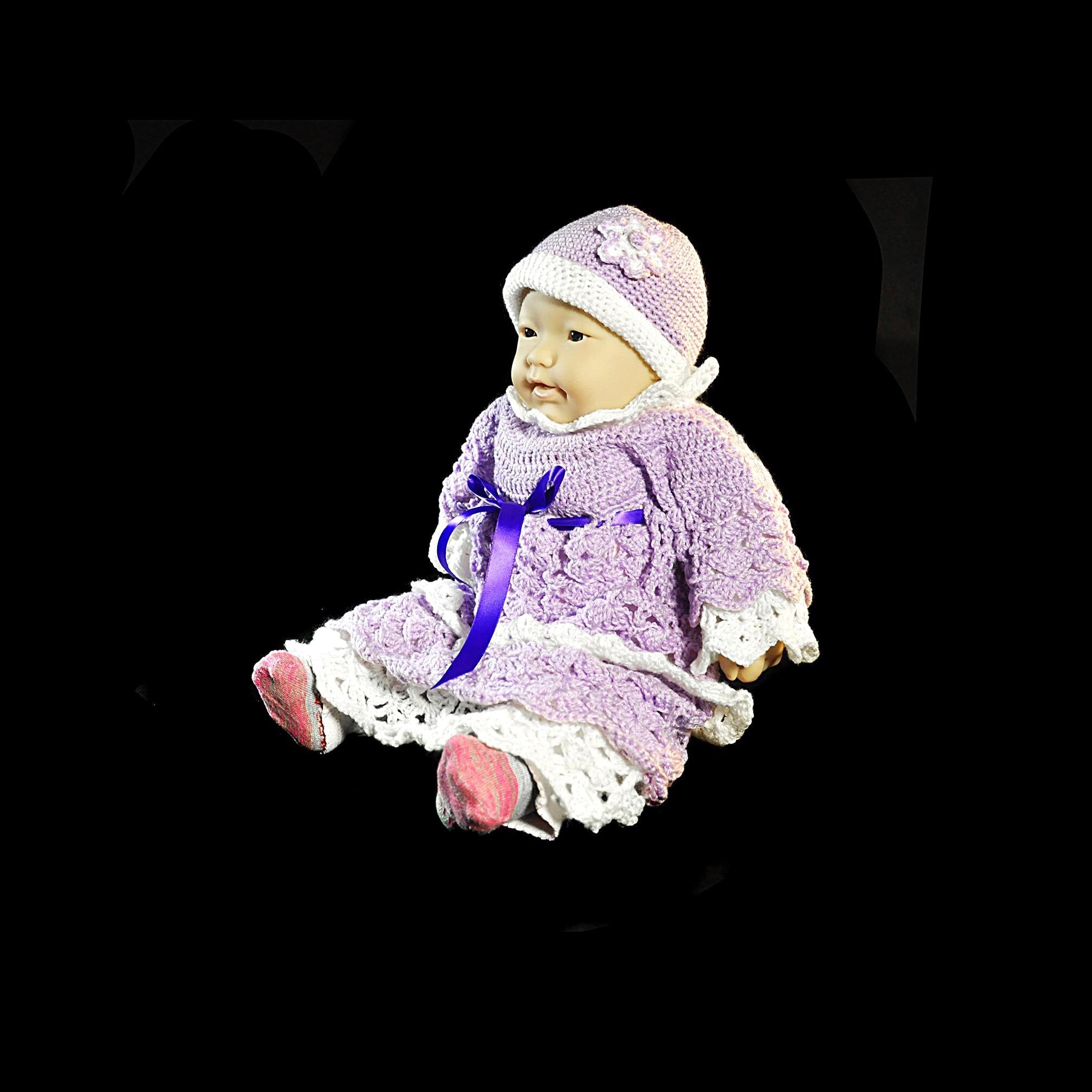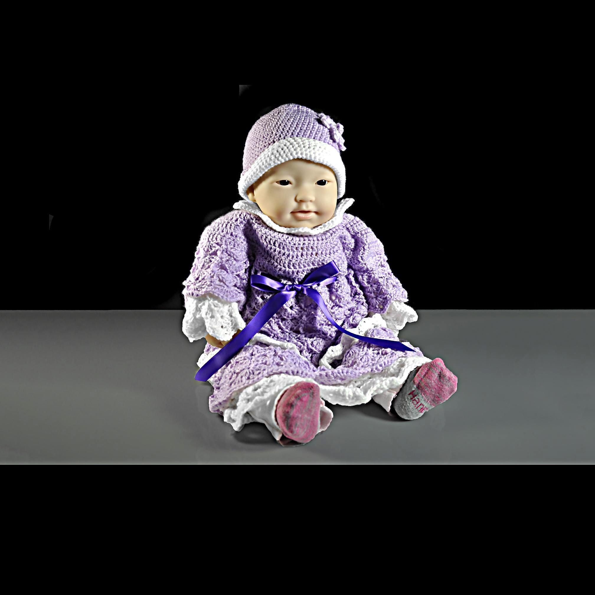 It’s finished with four buttons down the back, each with a small clear rhinestone center, and a lavender ribbon tie that can be adjusted for a perfect fit. The matching hat is accented with a hand-crocheted flower. This set fits most newborn to 3-month-old babies and also fits a 20-inch baby doll — perfect for collectors who love dressing their dolls in handmade clothes. Each piece I make is one of a kind. No two dresses will ever be exactly alike — just as every baby (and every cherished doll) is unique.