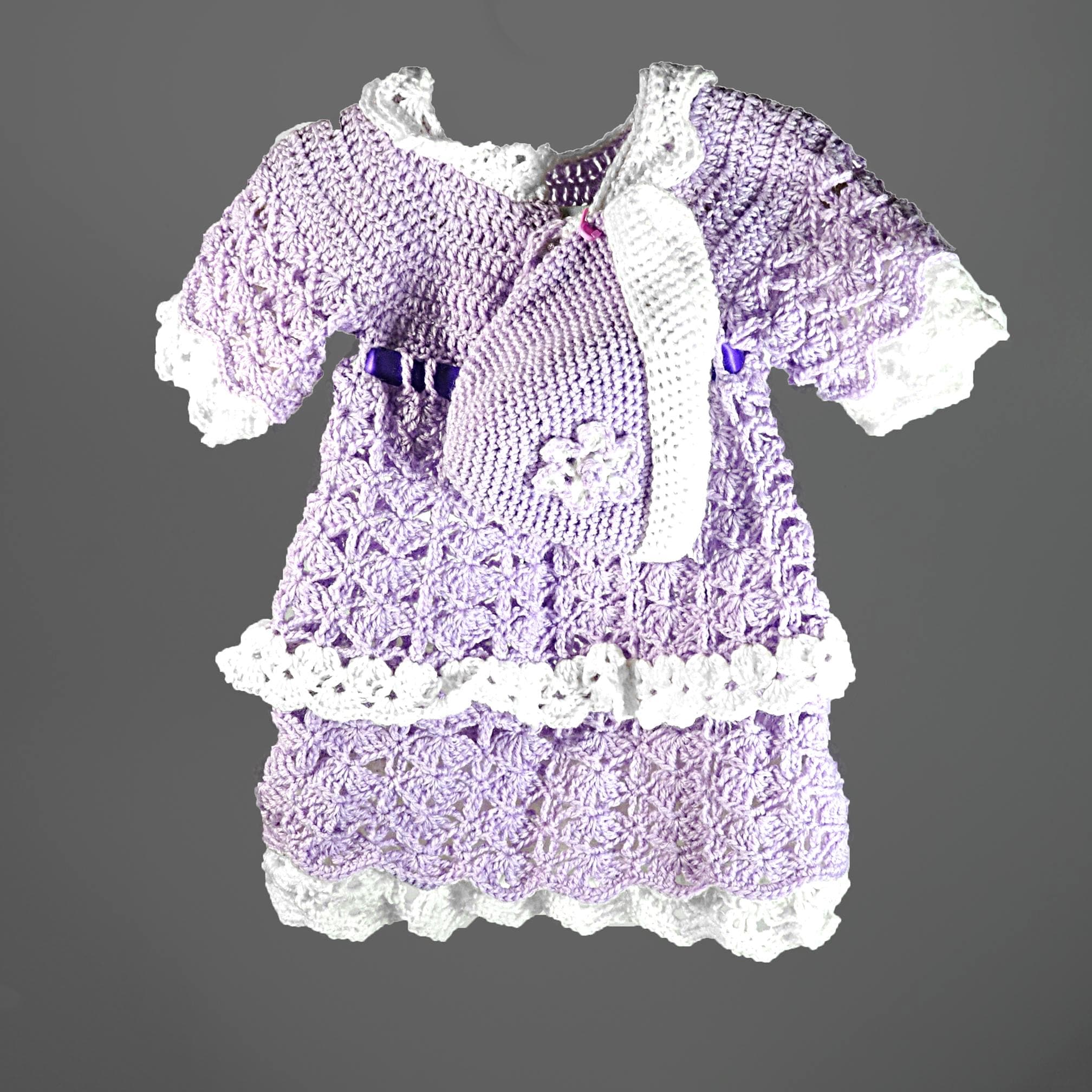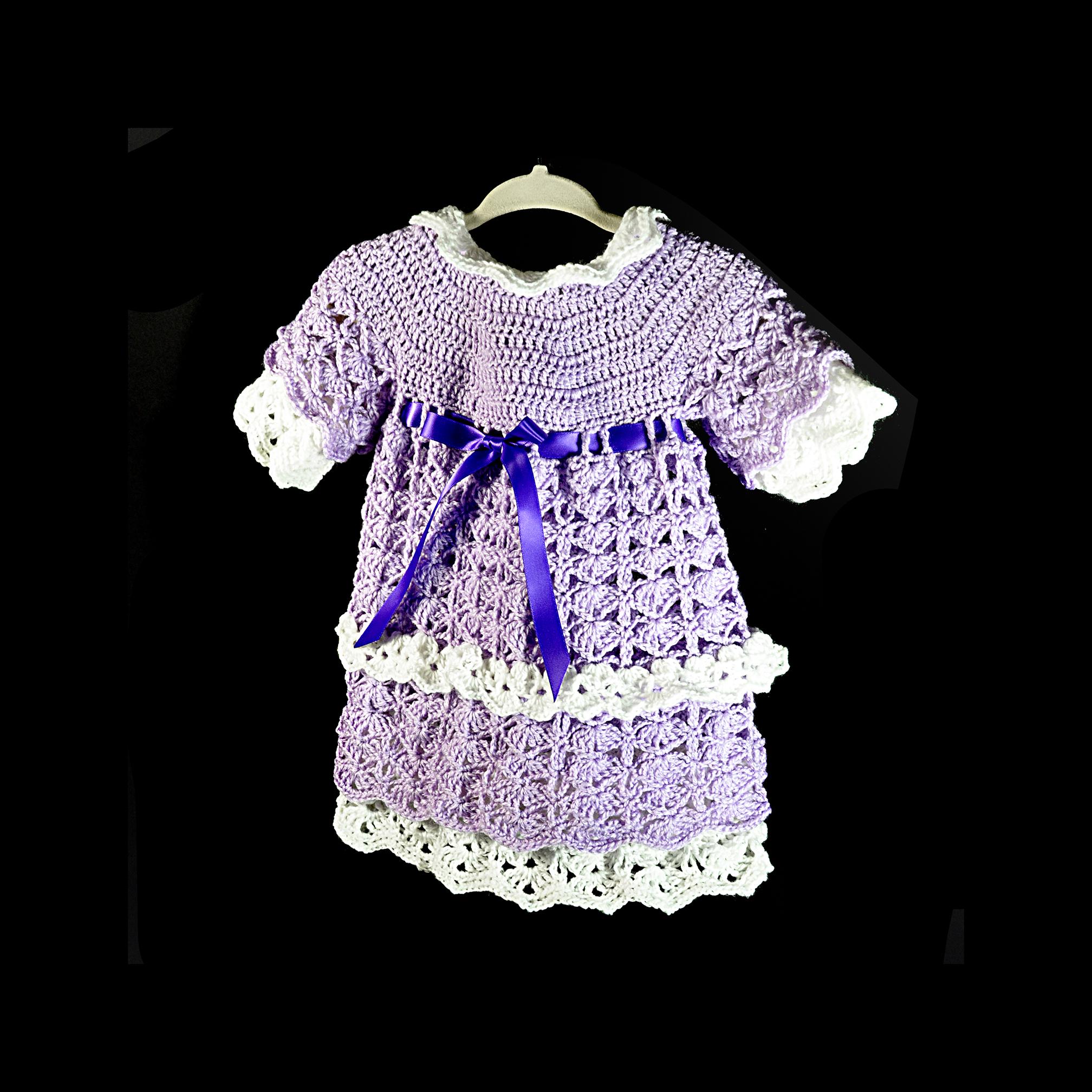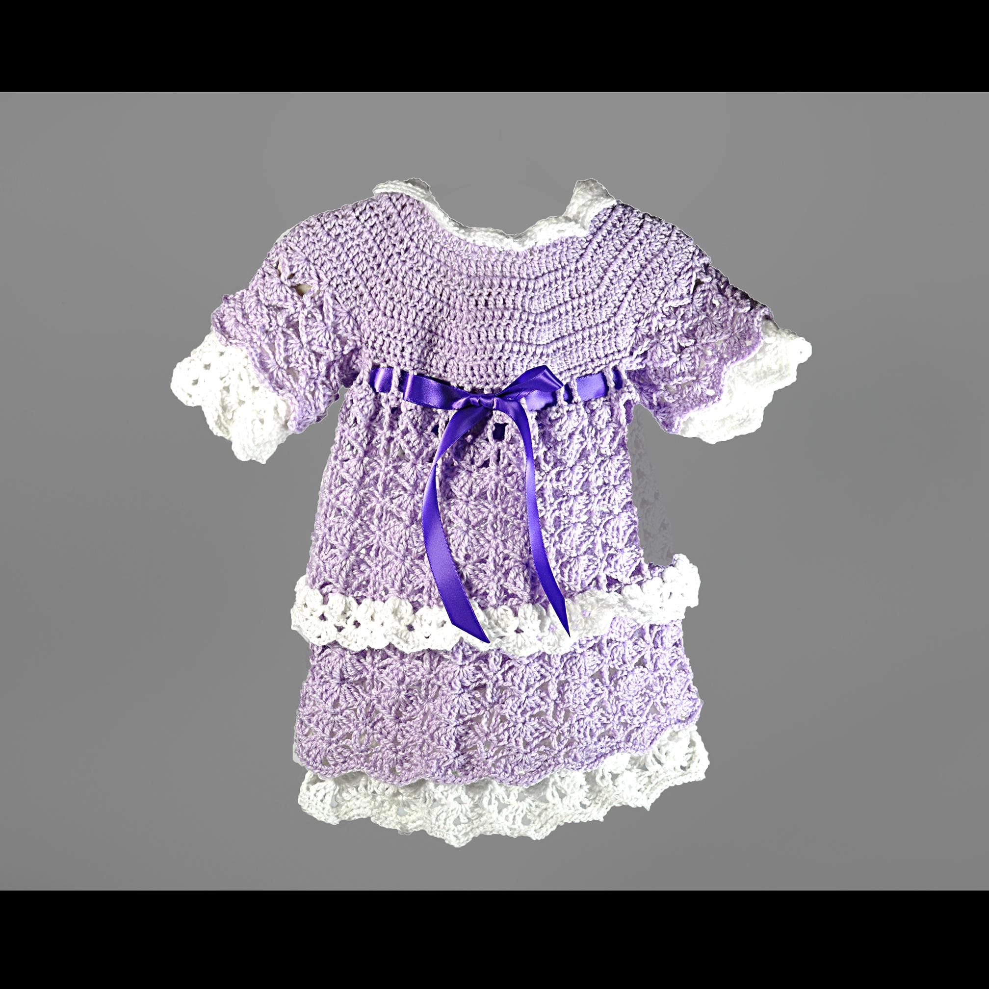 There’s something special about a handmade baby dress — especially one made the old-fashioned way, by feel and instinct rather than from a printed pattern. This little lavender and white set was crocheted one stitch at a time right here in my studio, with the design coming together as I went along. The shell stitch pattern gives it a beautiful texture and an heirloom look, while the satin ribbon and rhinestone buttons add a gentle touch of sparkle.