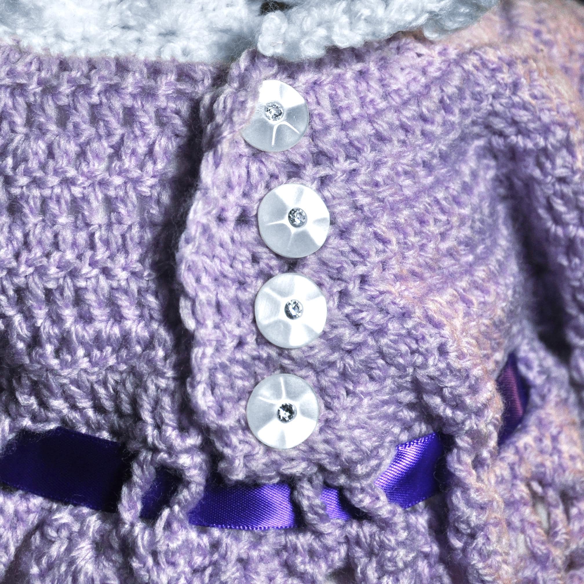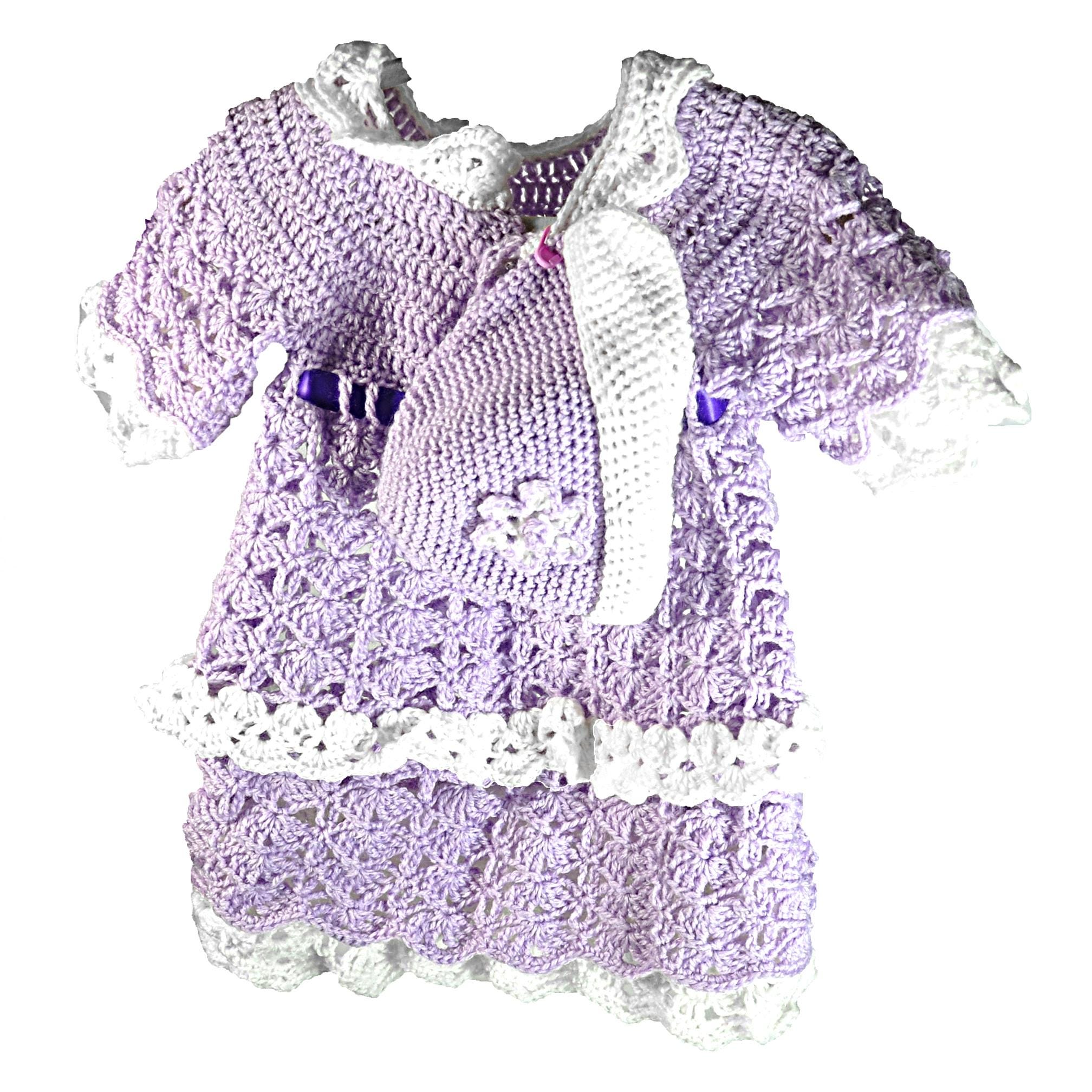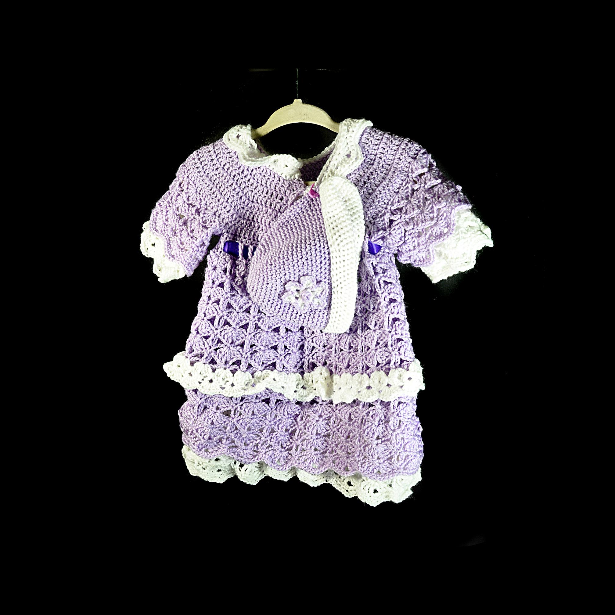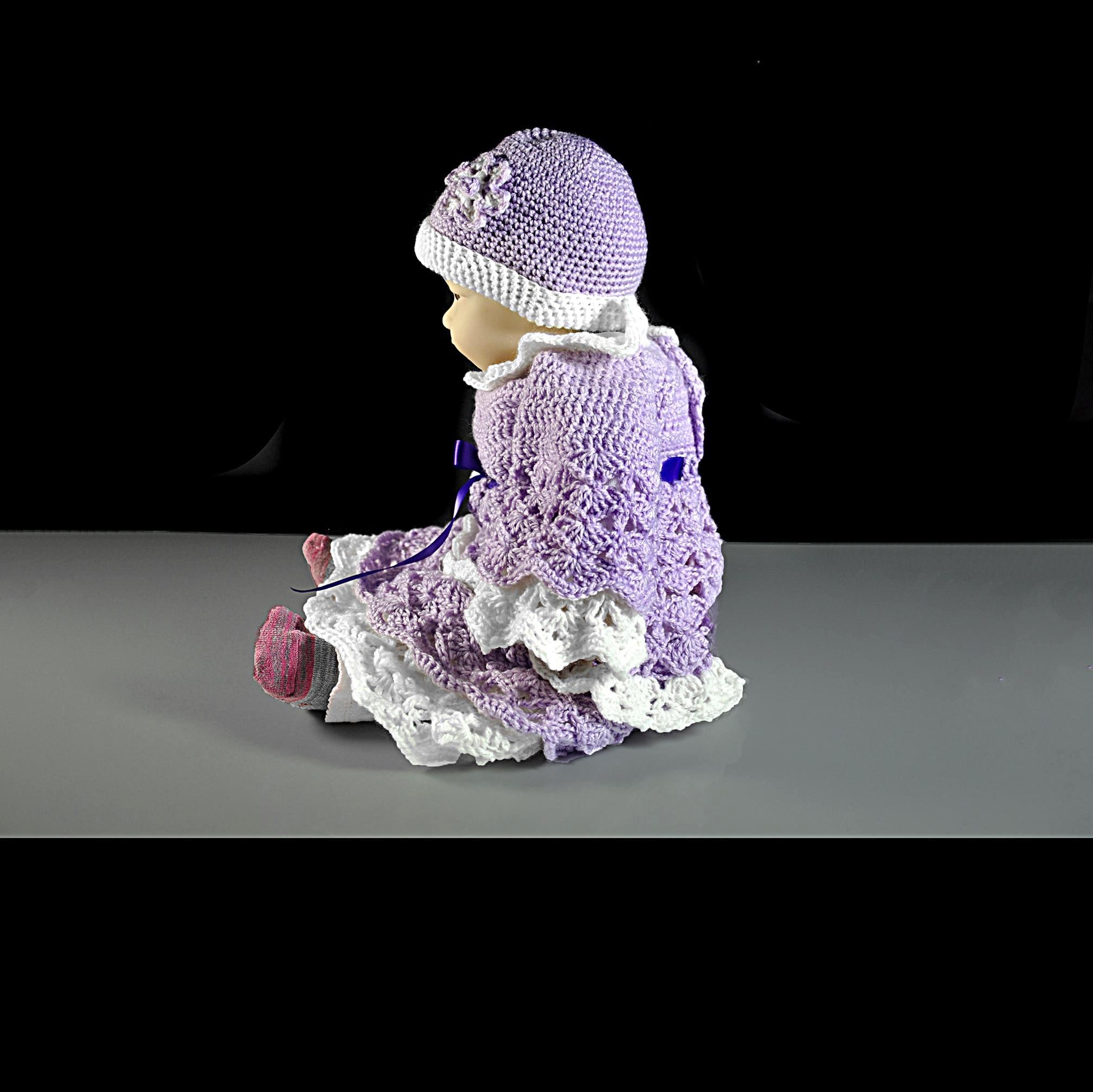 There’s something special about a handmade baby dress — especially one made the old-fashioned way, by feel and instinct rather than from a printed pattern. This little lavender and white set was crocheted one stitch at a time right here in my studio, with the design coming together as I went along. The shell stitch pattern gives it a beautiful texture and an heirloom look, while the satin ribbon and rhinestone buttons add a gentle touch of sparkle.
