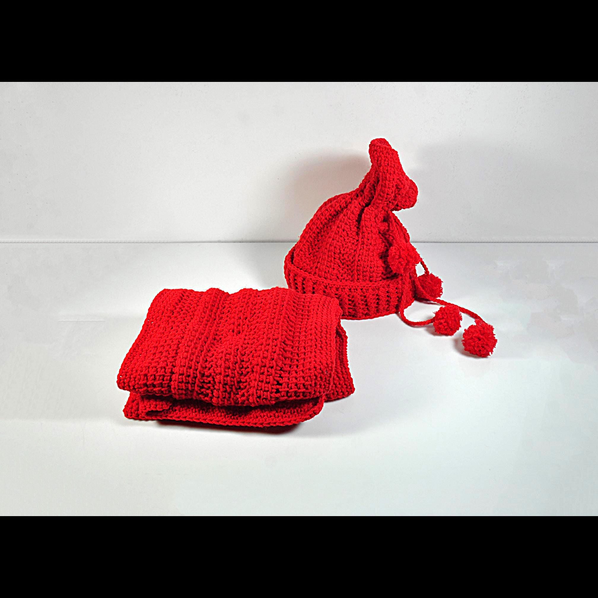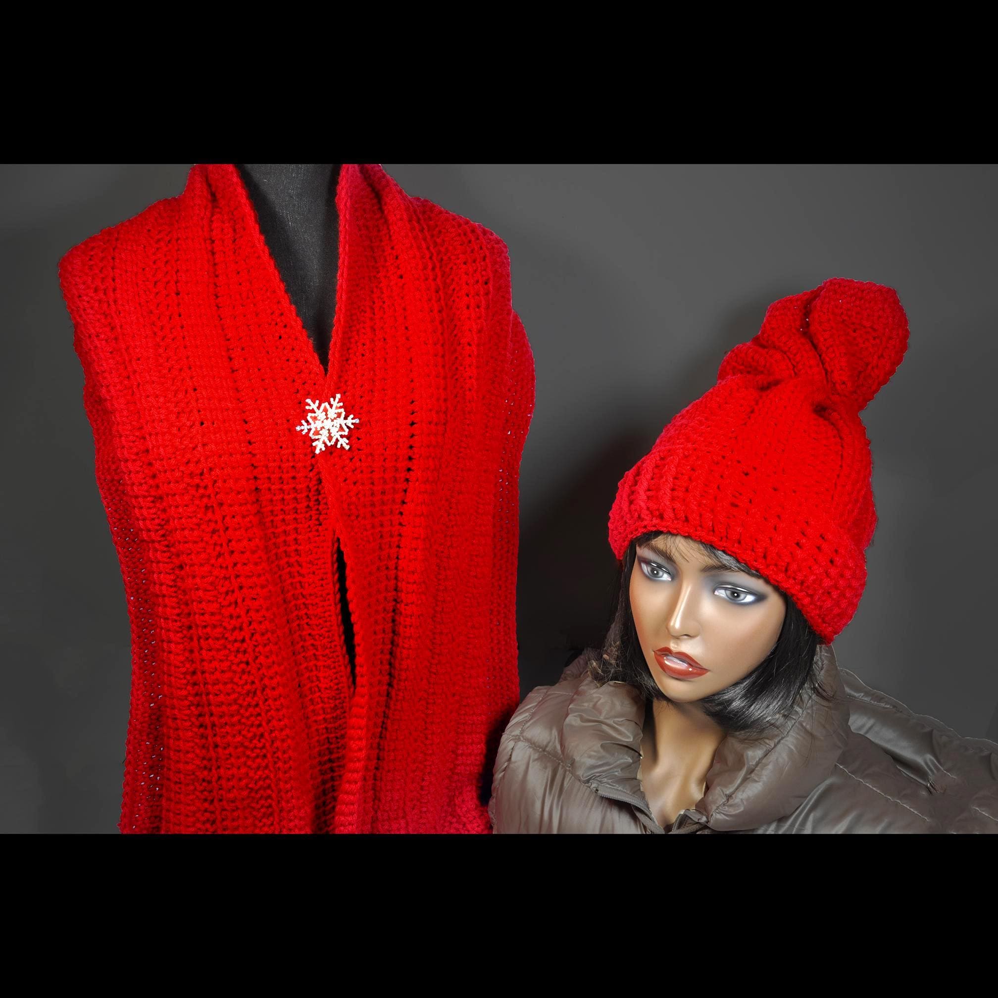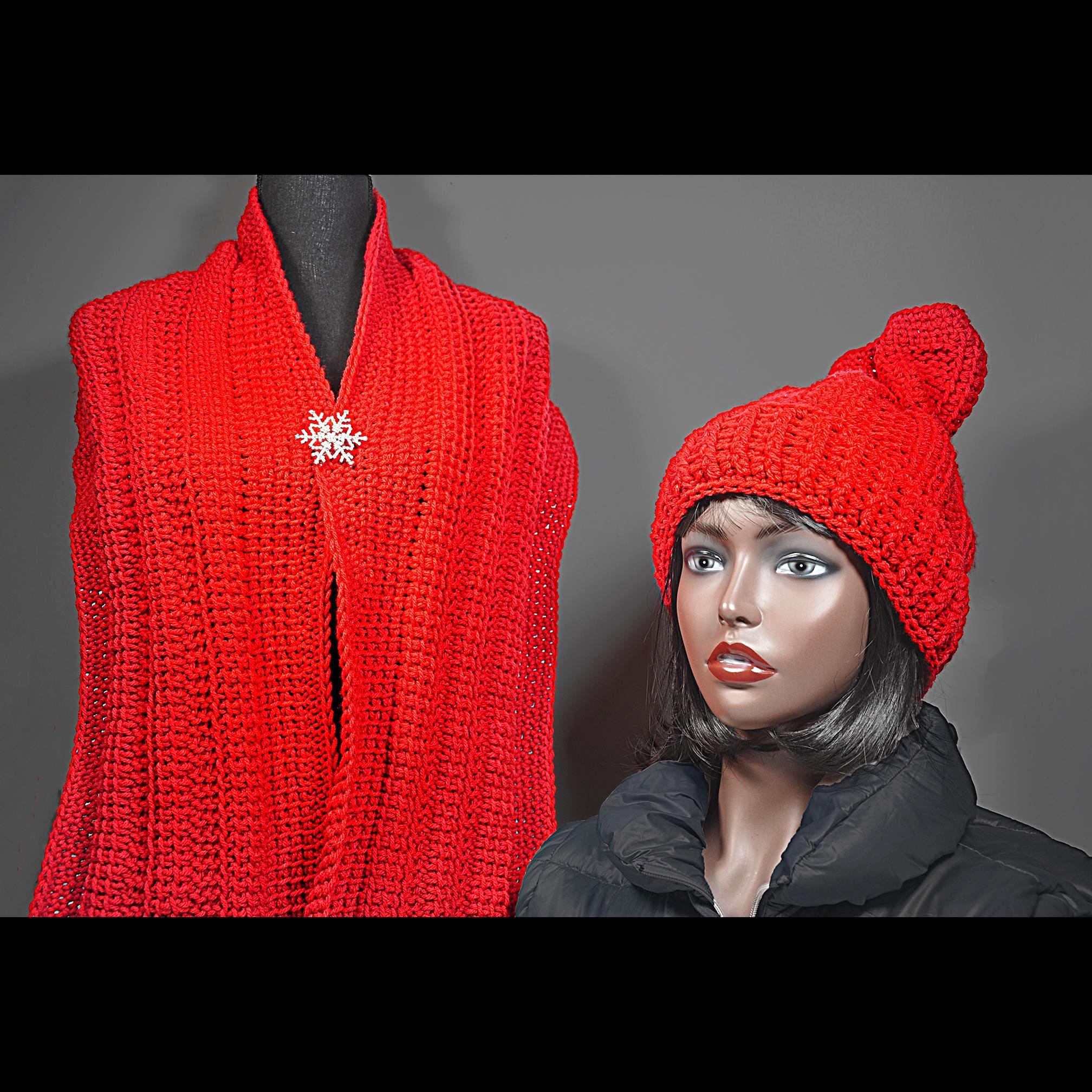 This hat and scarf set was made slowly, stitch by stitch, using Tunisian crochet, a technique that gives fabric real body and warmth. It’s not floppy, and it’s not thin. This is the kind of winter set you actually reach for when the cold settles in. The yarn is Caron 100% acrylic in Scarlet, a true bright red that’s hard to photograph but beautiful in person. It holds its color, keeps its shape, and is easy to care for—no fuss, no special handling. I chose it on purpose, especially for people who can’t wear wool. The hat has a soft slouch with long ties and handmade pom-poms for a bit of personality, while still being completely wearable. The scarf is generously sized so it can be wrapped, layered, or worn loose without feeling skimpy. This is a coordinated set, not mix-and-match leftovers. Made together, meant to be worn together, and built to last more than one winter.