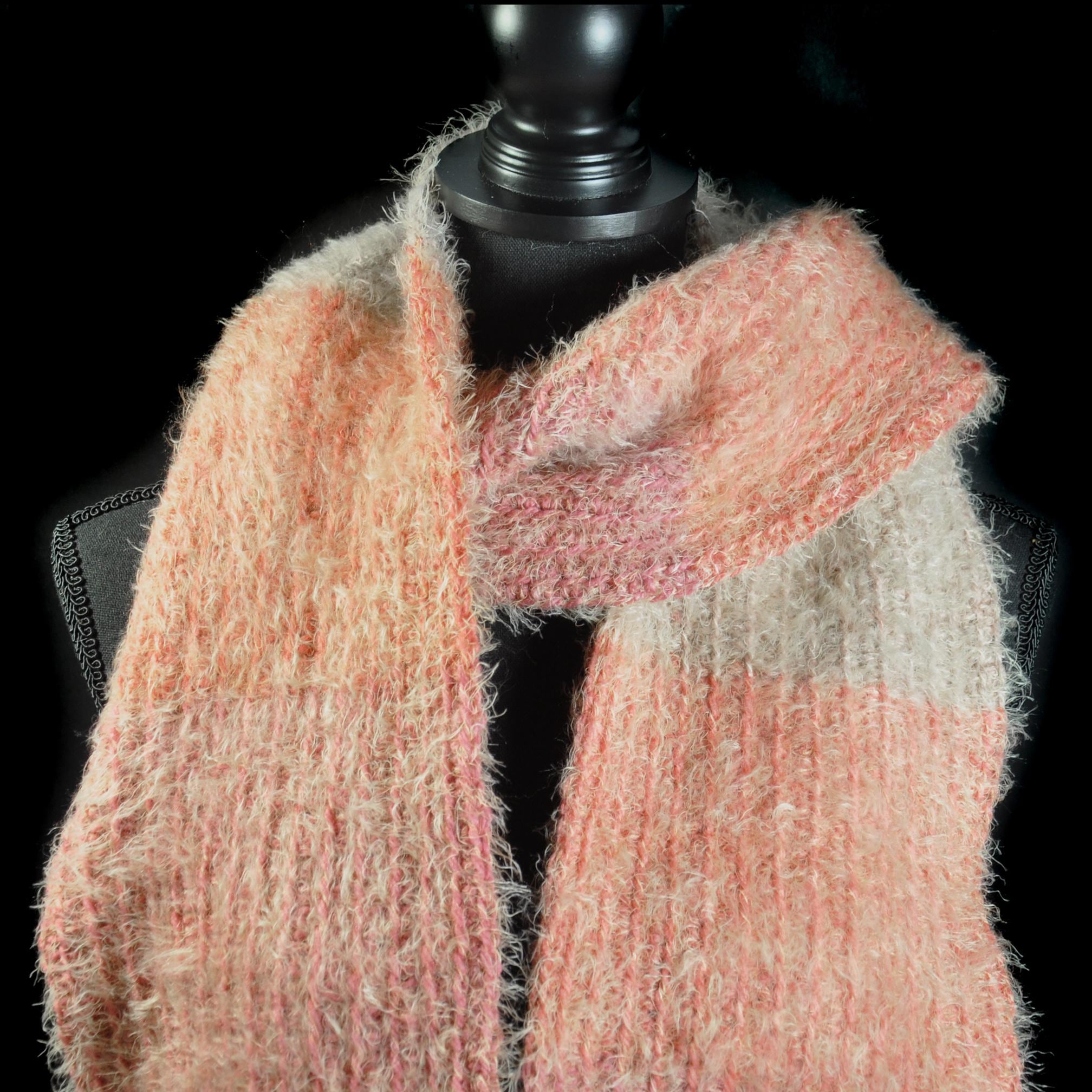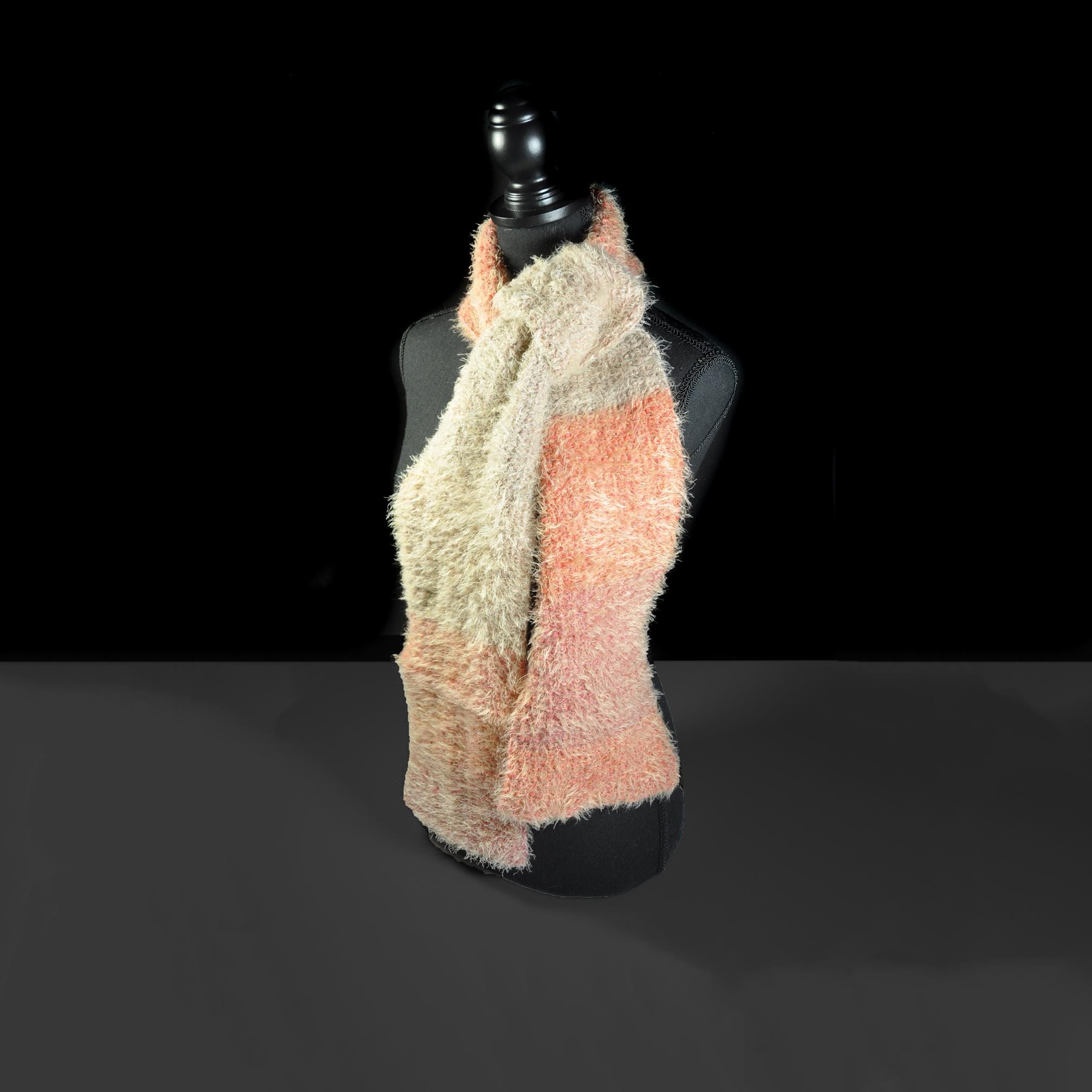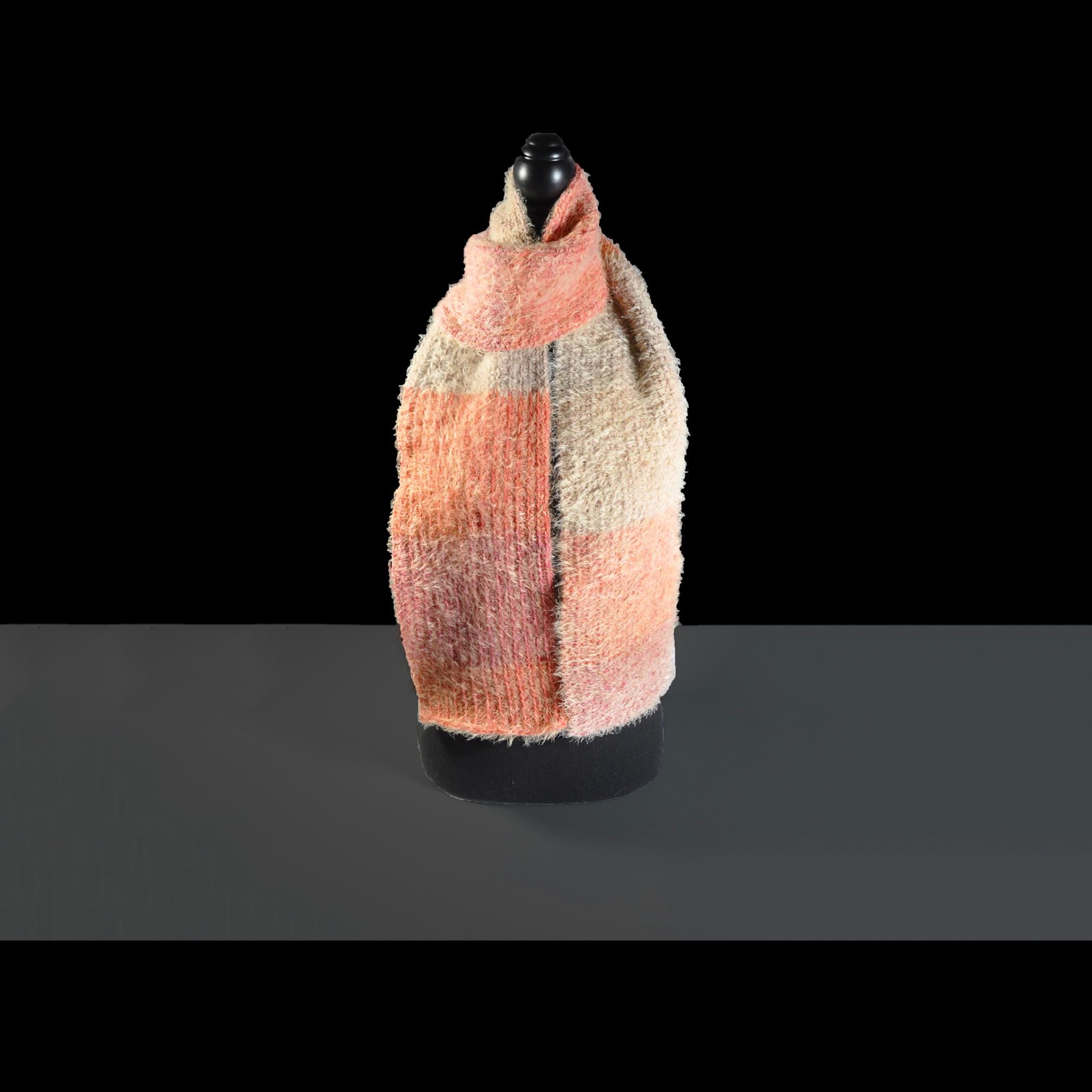 There’s nothing fancy about the way this scarf came together. Just Tunisian crochet, a quiet afternoon, and yarn that feels like a soft old sweater. The colors shift from peach to blush to a quiet taupe, like sunrise in the winter when you’re staring out the window with your first cup of coffee. The yarn is Caron Latte Cakes in “Red Macaron,” fuzzy and warm without being scratchy. If you’re tired of scarves that look nice but don’t actually keep the cold out, this one will do the job. It’s long enough—66 inches—to wrap once or twice, and wide enough at 7 inches to feel like you’re getting real coverage. It’s soft, warm, and has that slight fuzzy halo that comes with this yarn. Looks good with denim, wool coats, or just thrown over your shoulder. If you need a scarf that’s actually pleasant to wear, this one won’t let you down.