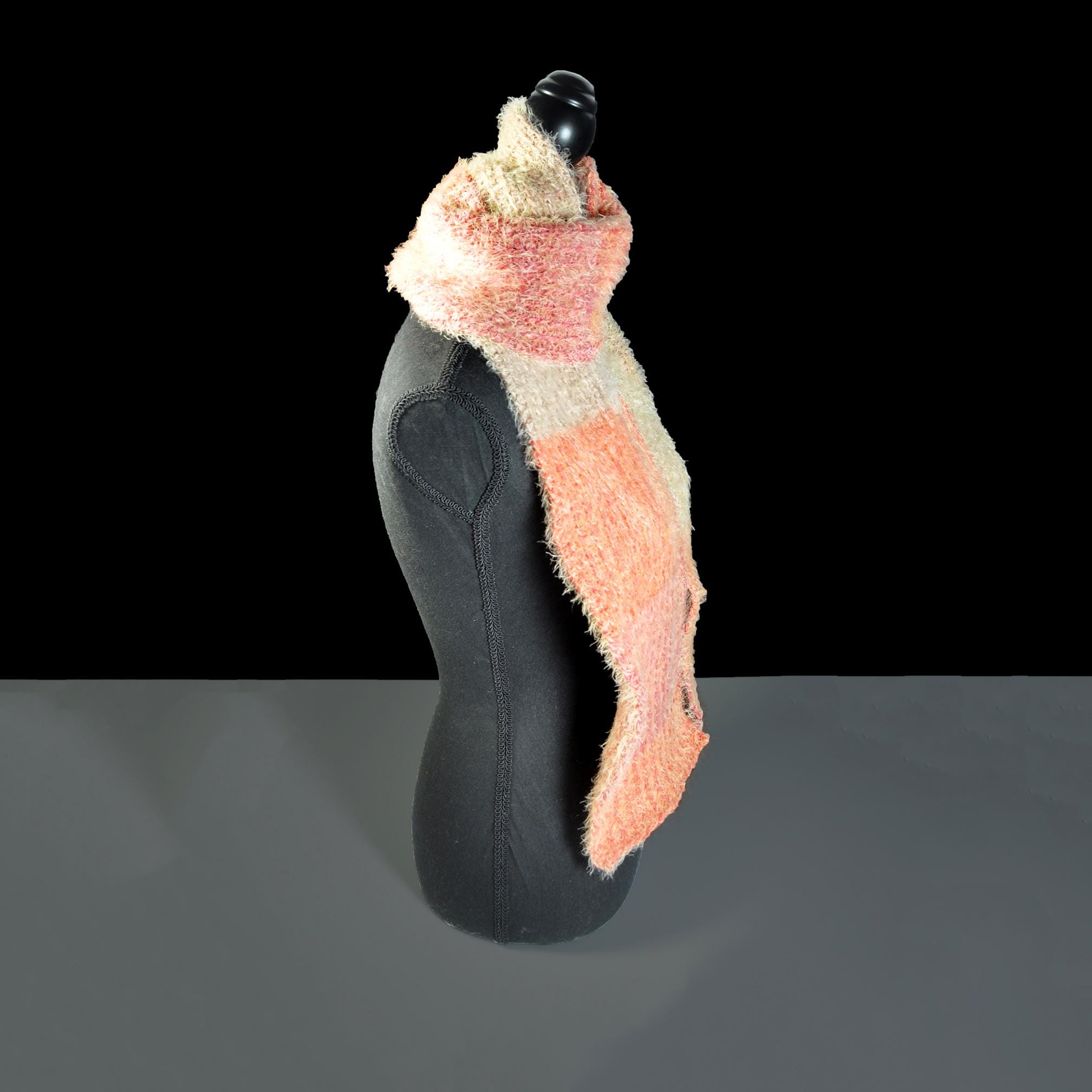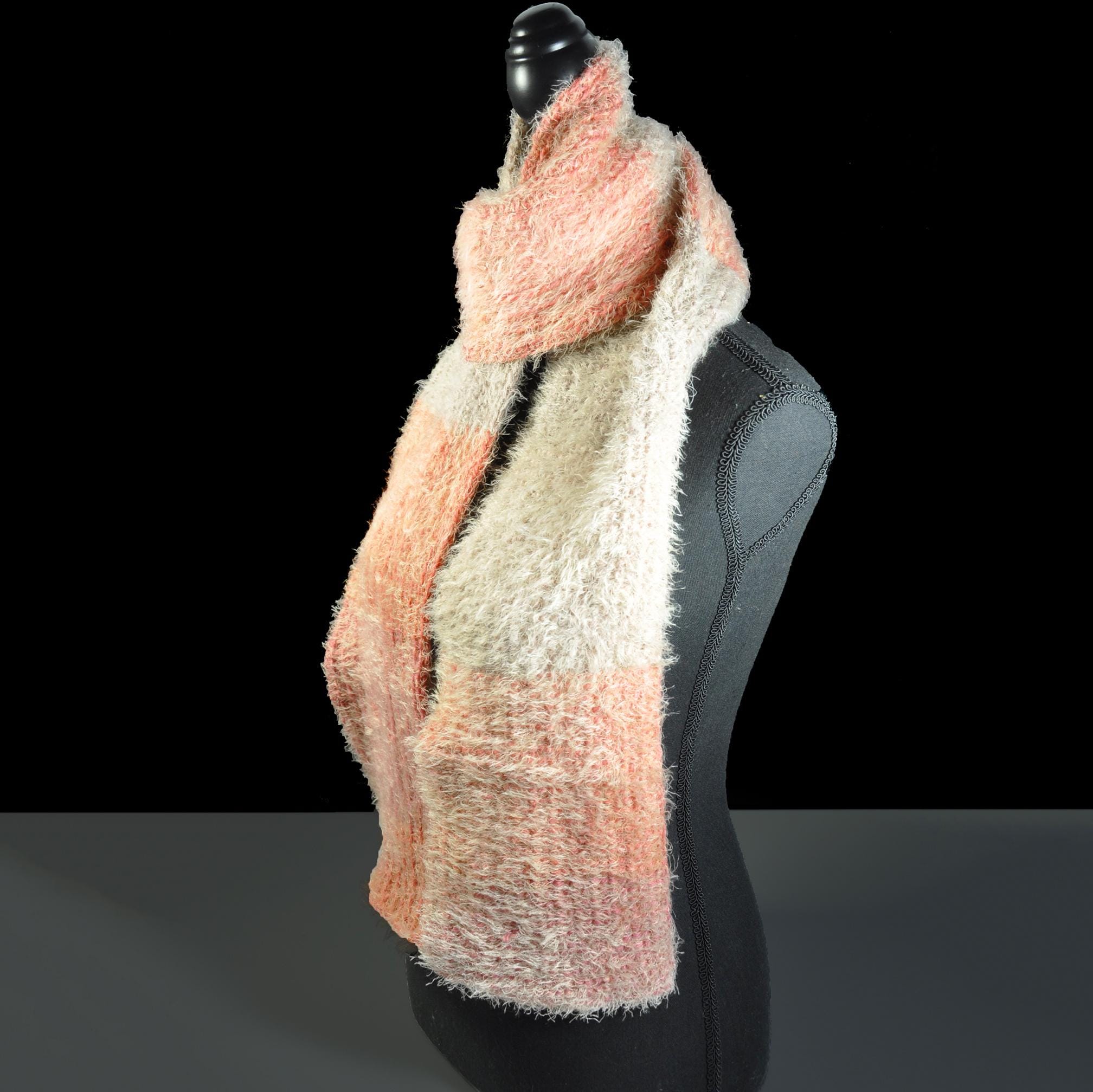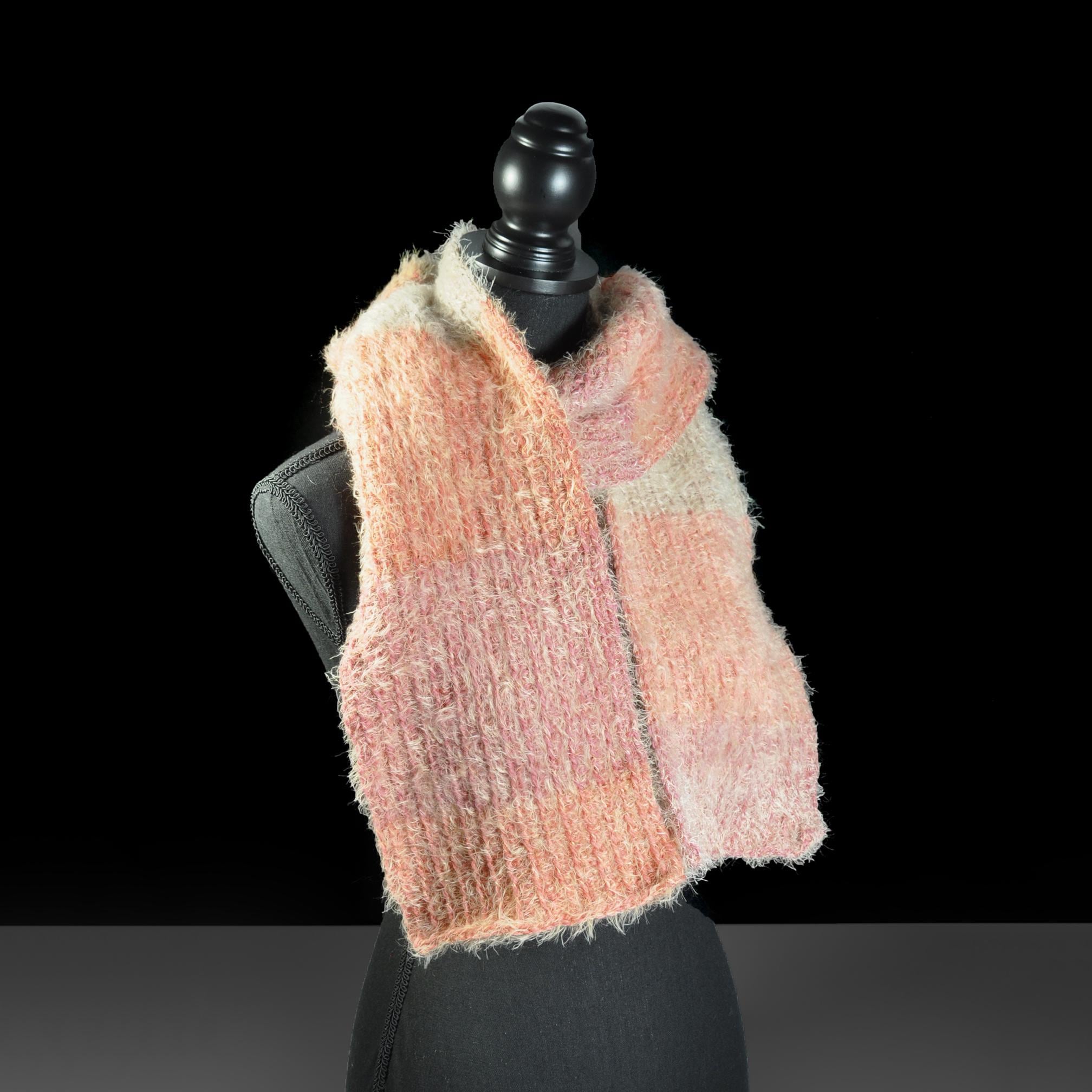 There’s nothing fancy about the way this scarf came together. Just Tunisian crochet, a quiet afternoon, and yarn that feels like a soft old sweater. The colors shift from peach to blush to a quiet taupe, like sunrise in the winter when you’re staring out the window with your first cup of coffee. The yarn is Caron Latte Cakes in “Red Macaron,” fuzzy and warm without being scratchy. If you’re tired of scarves that look nice but don’t actually keep the cold out, this one will do the job. It’s long enough—66 inches—to wrap once or twice, and wide enough at 7 inches to feel like you’re getting real coverage. It’s soft, warm, and has that slight fuzzy halo that comes with this yarn. Looks good with denim, wool coats, or just thrown over your shoulder. If you need a scarf that’s actually pleasant to wear, this one won’t let you down.