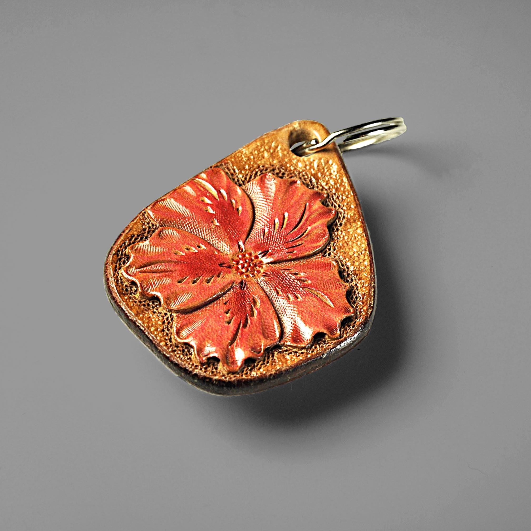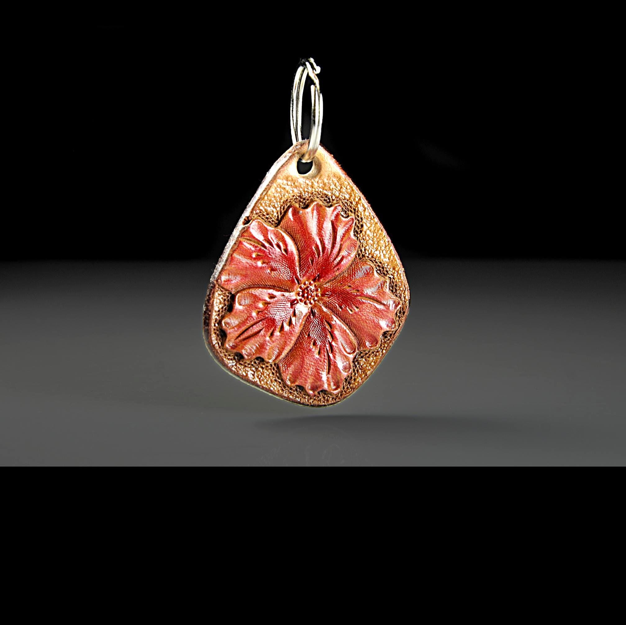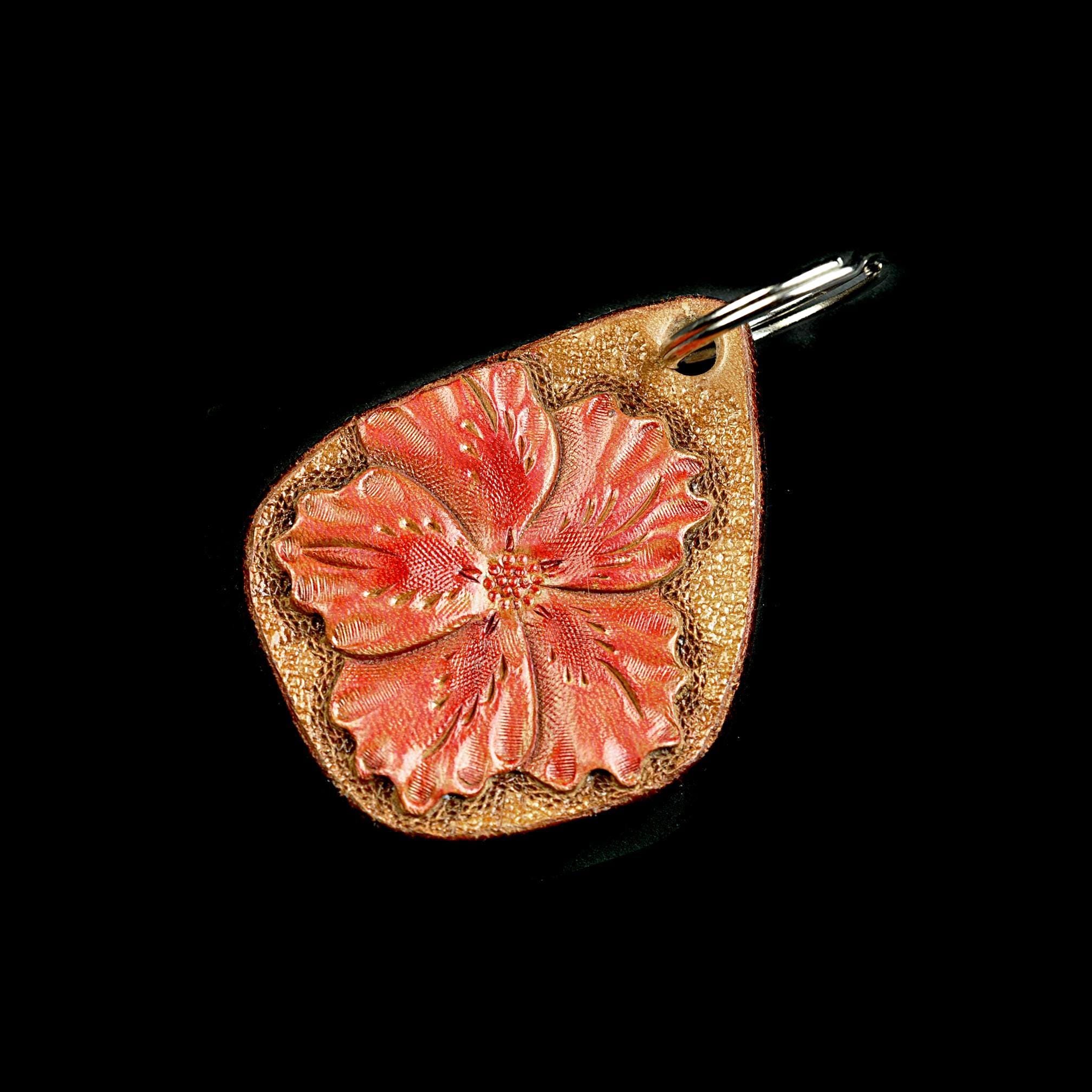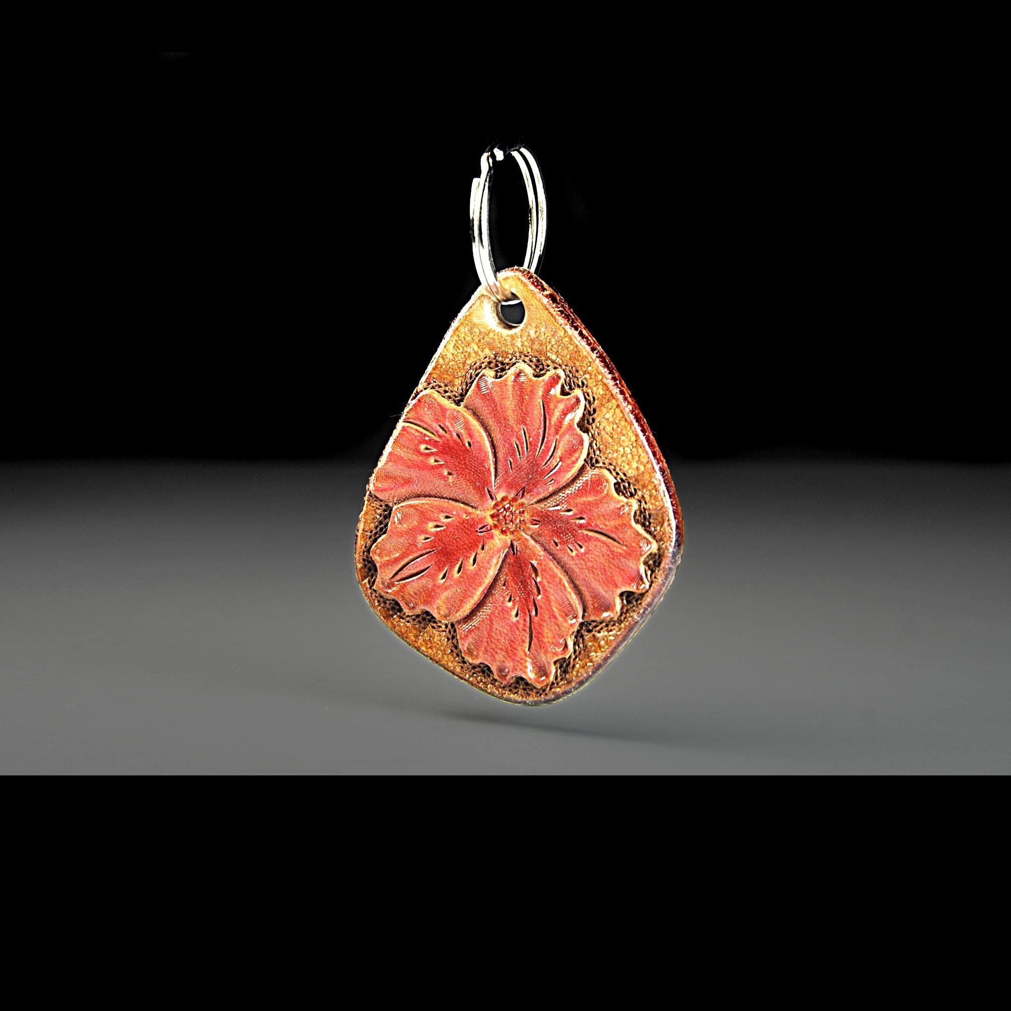This leather keychain is hand tooled and finished the old-fashioned way from heavy 13 oz saddle skirting leather — the same type of leather used for working tack. This is the leather we use for all of our keychains. Thick, sturdy, and made to last. The flower design is carved by hand, not stamped by machine. After tooling, it is airbrushed a lovely red, the edges are beveled and burnished smooth, then the piece is oiled to keep the leather strong and supple. It feels solid in the hand and will age beautifully over time. Sized right for everyday use without being bulky. Works just as well as a zipper pull on a bag or tote — and unlike metal pulls or beads, leather won’t scratch your bag. Built for daily use, not decoration. The kind of small leather good that just gets better with years of handling.