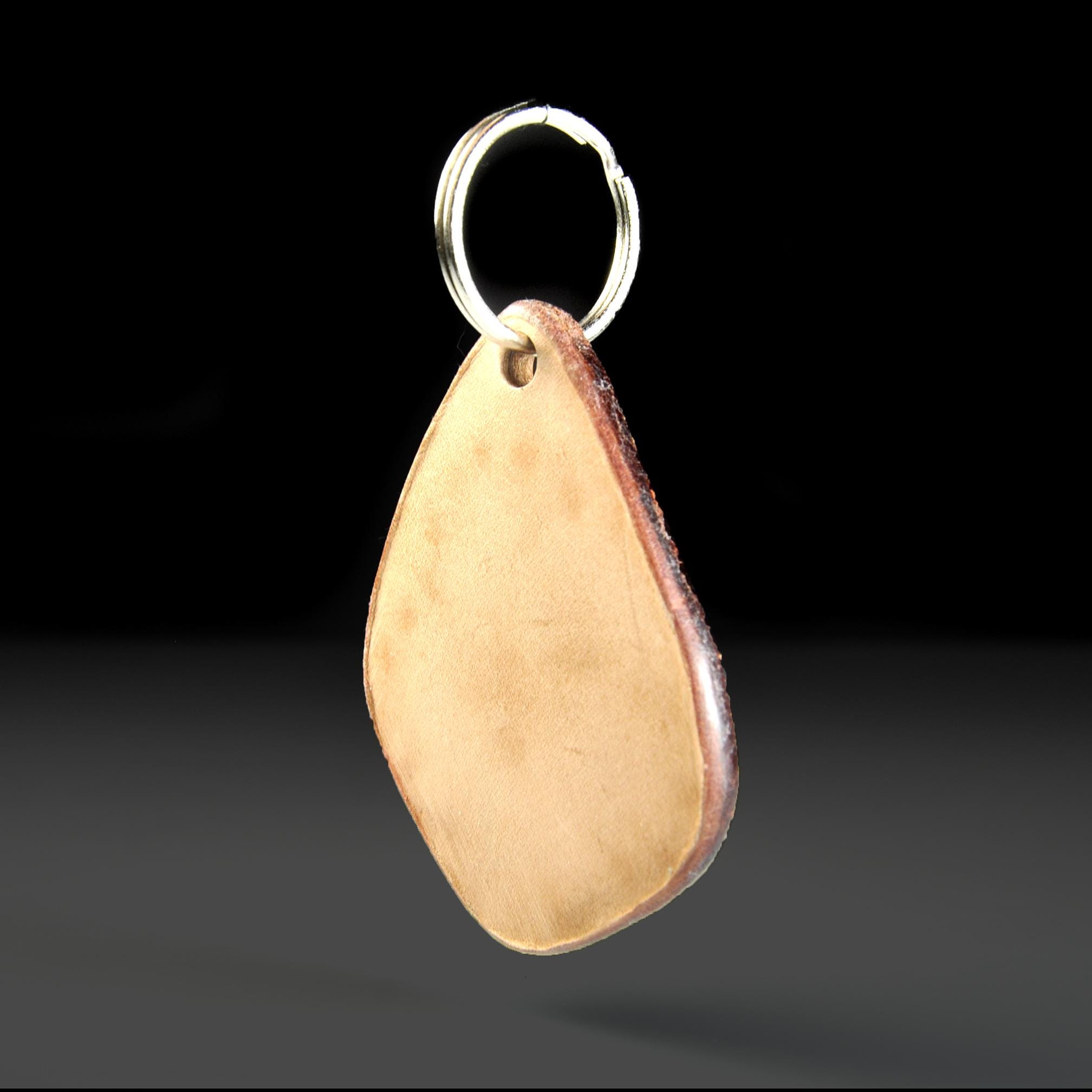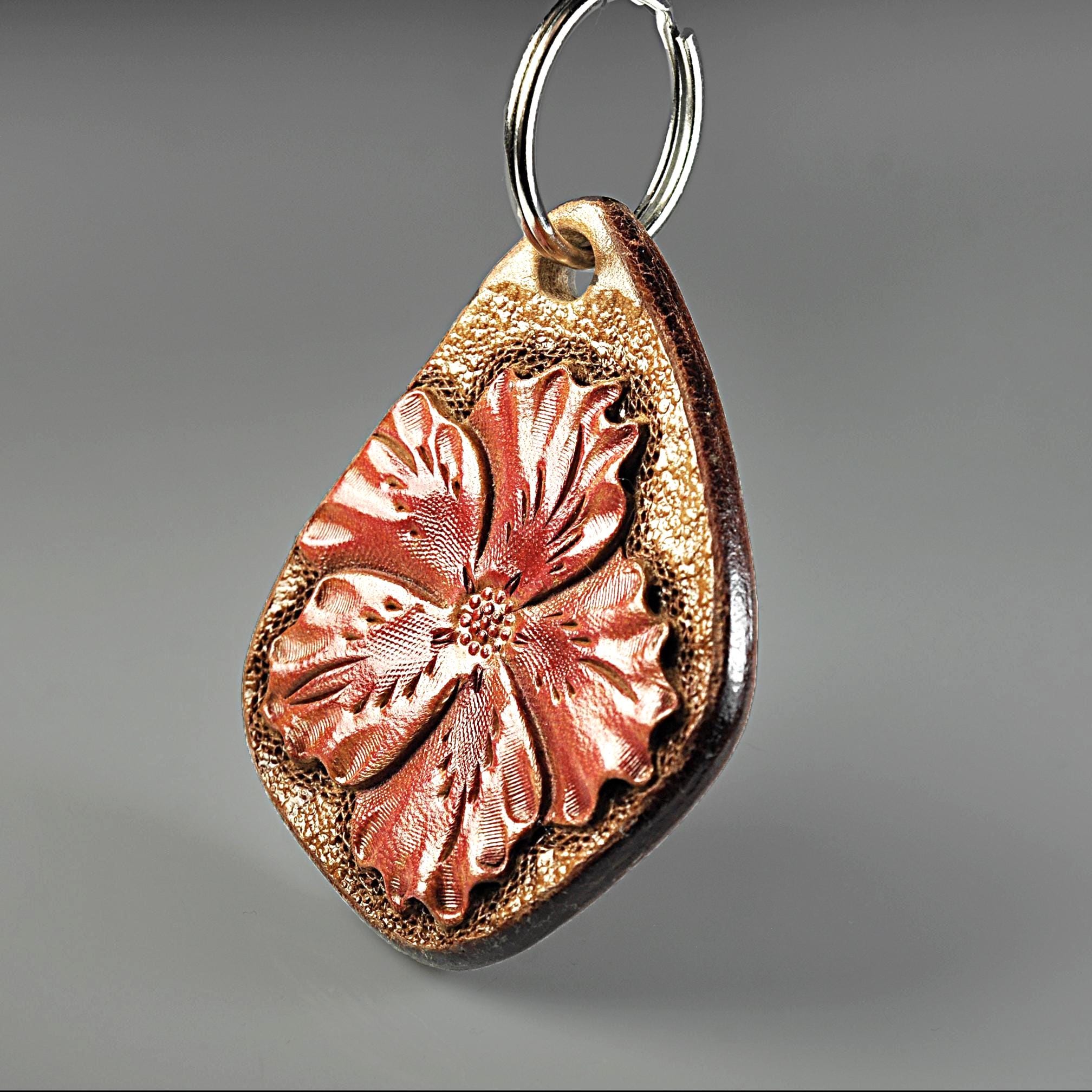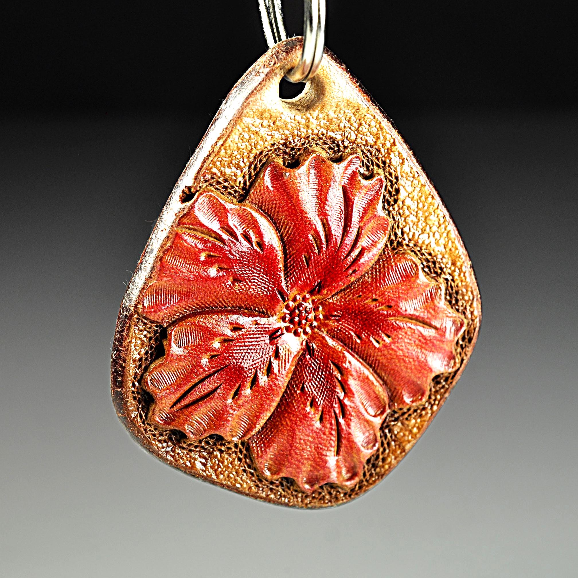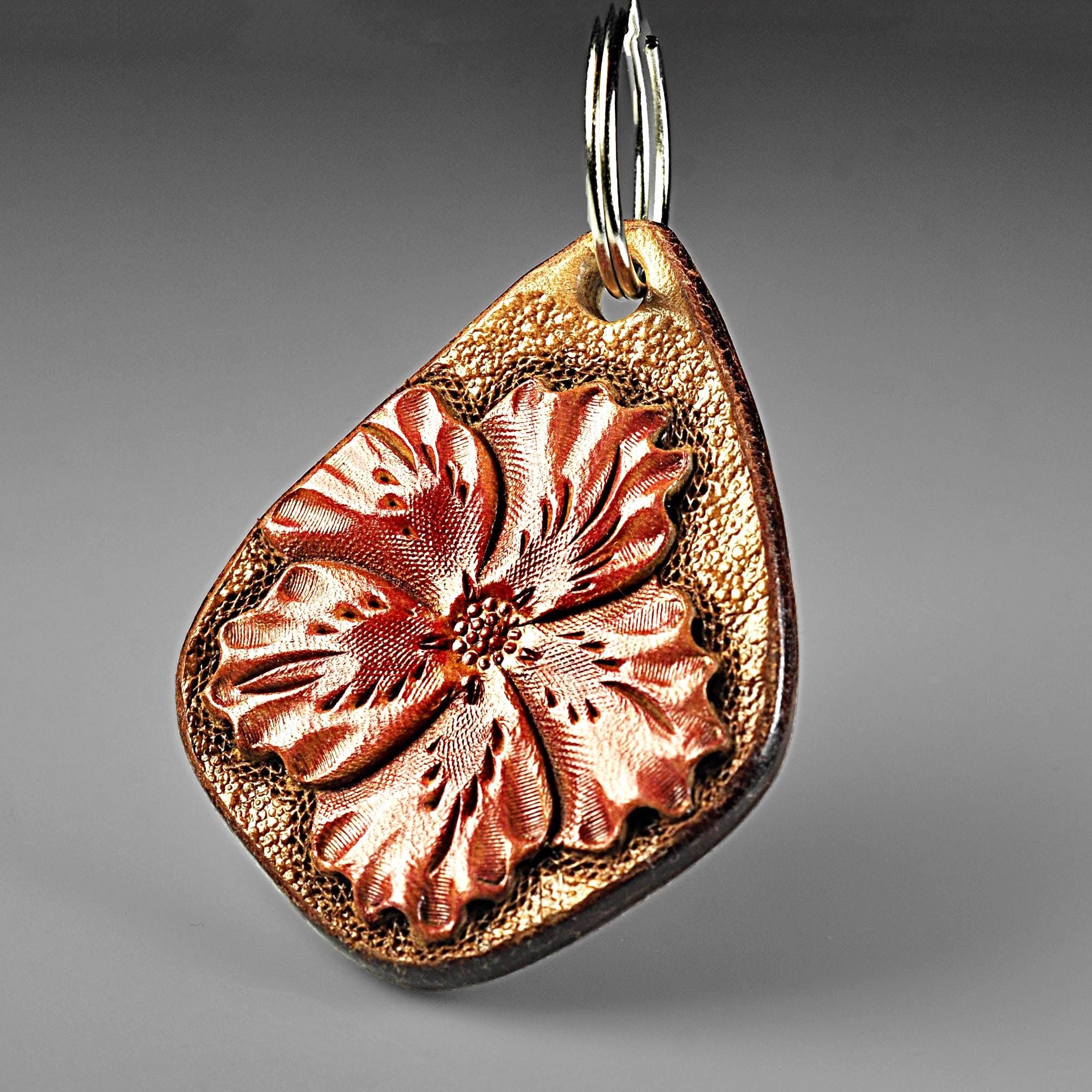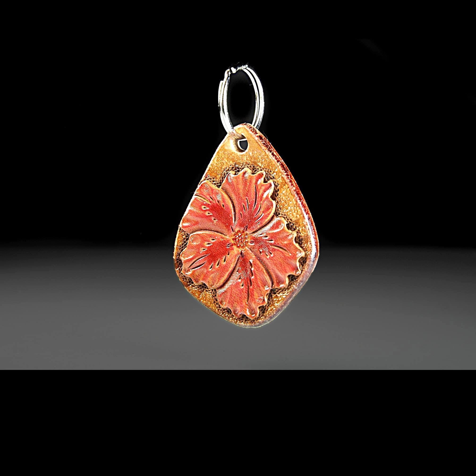 This leather keychain is hand tooled and finished the old-fashioned way from heavy 13 oz saddle skirting leather — the same type of leather used for working tack. This is the leather we use for all of our keychains. Thick, sturdy, and made to last. The flower design is carved by hand, not stamped by machine. After tooling, it is airbrushed a lovely red, the edges are beveled and burnished smooth, then the piece is oiled to keep the leather strong and supple. It feels solid in the hand and will age beautifully over time. Sized right for everyday use without being bulky. Works just as well as a zipper pull on a bag or tote — and unlike metal pulls or beads, leather won’t scratch your bag. Built for daily use, not decoration. The kind of small leather good that just gets better with years of handling.