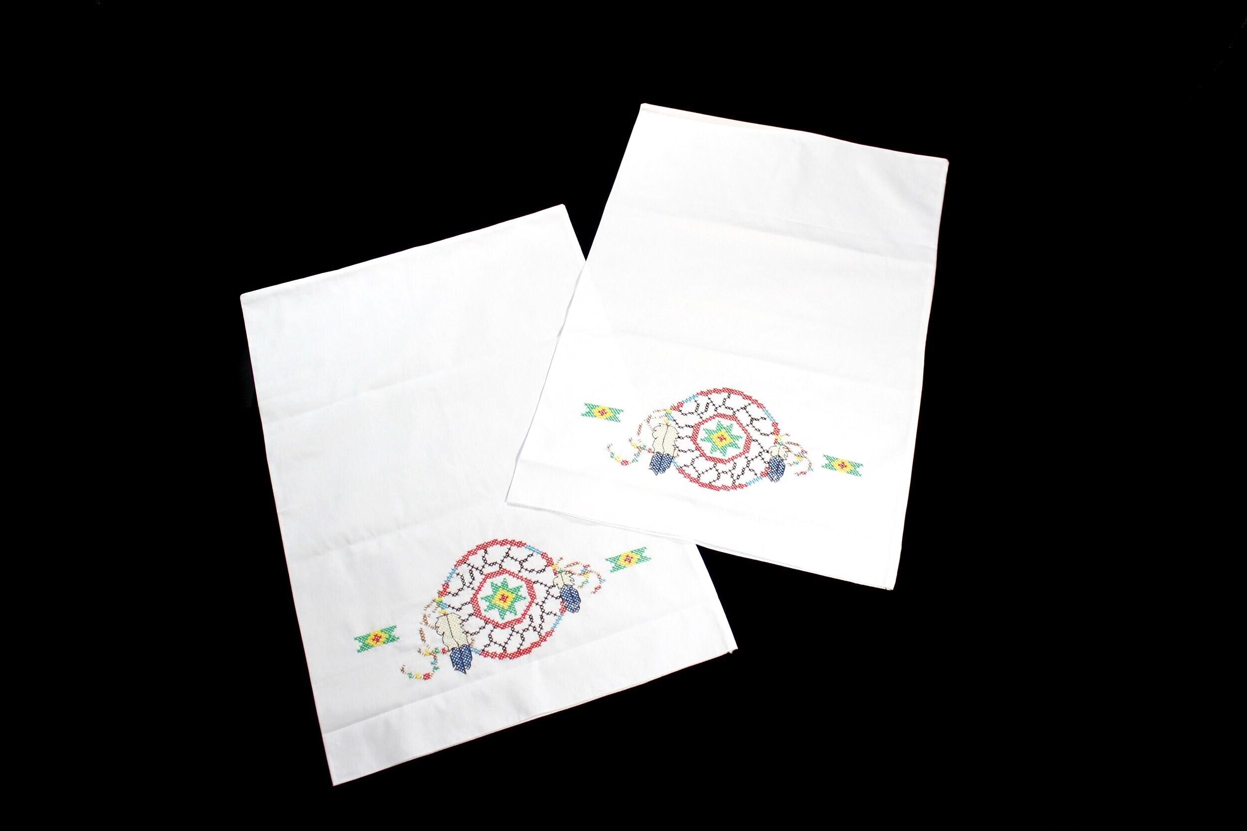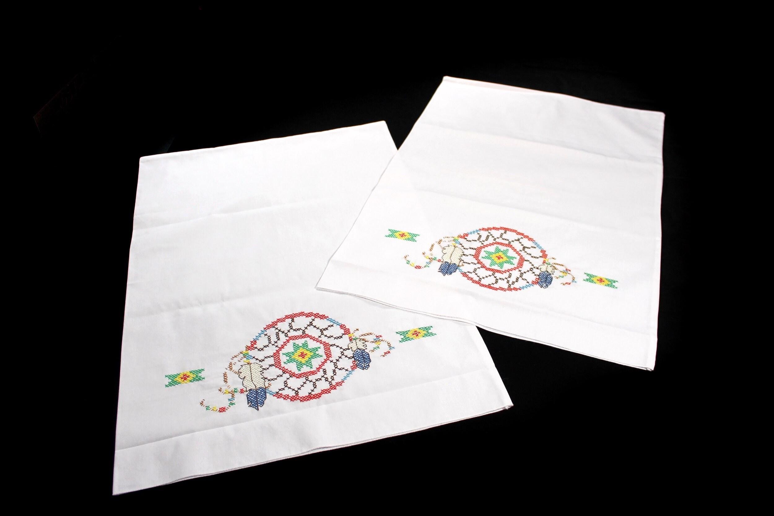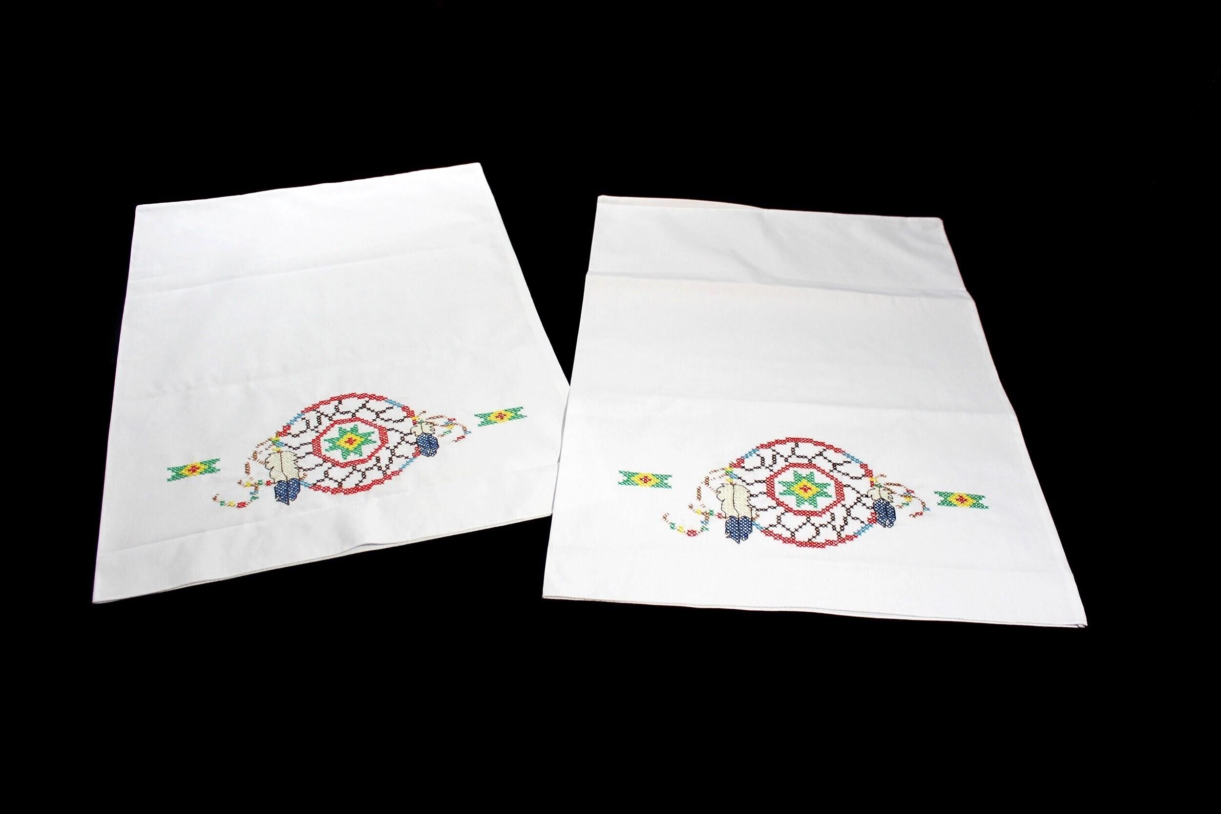 These pillowcases were made the old-fashioned way — one careful stitch at a time. This matching set of two handmade pillowcases features a dreamcatcher design worked in cross stitch embroidery across crisp white fabric. The colorful stitching creates a warm Southwestern feel while still keeping the overall look calm and welcoming. Each case carries the quiet character that only hand embroidery brings. No machines, no shortcuts — just patient needlework meant to be used and enjoyed every day. They’re perfect for adding handmade comfort to a bedroom, guest room, camp, or cozy retreat space. The design adds personality without overpowering the room, making them easy to blend with rustic, farmhouse, or Southwestern décor. These are the kinds of linens that make a bed feel thoughtfully prepared.
