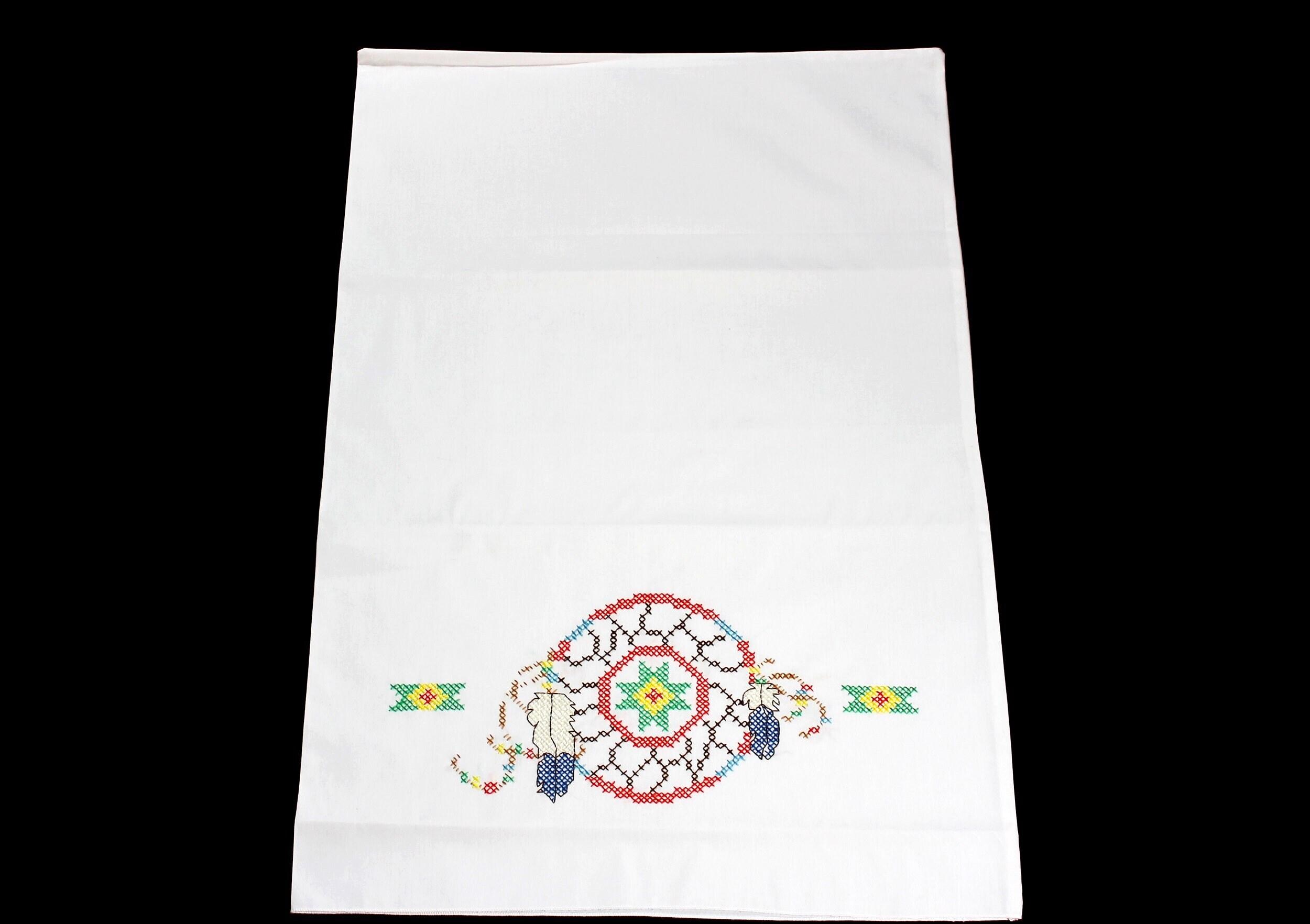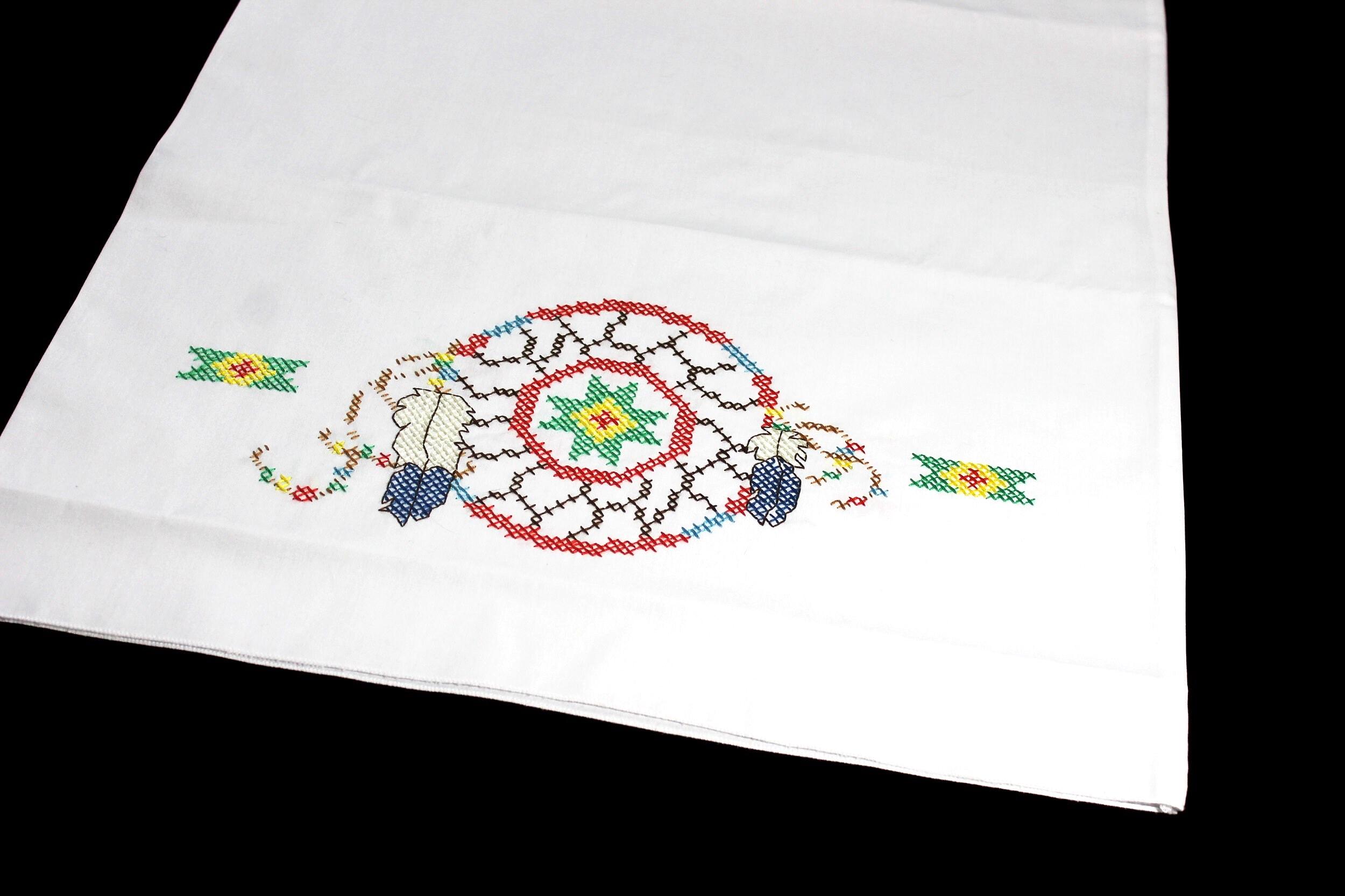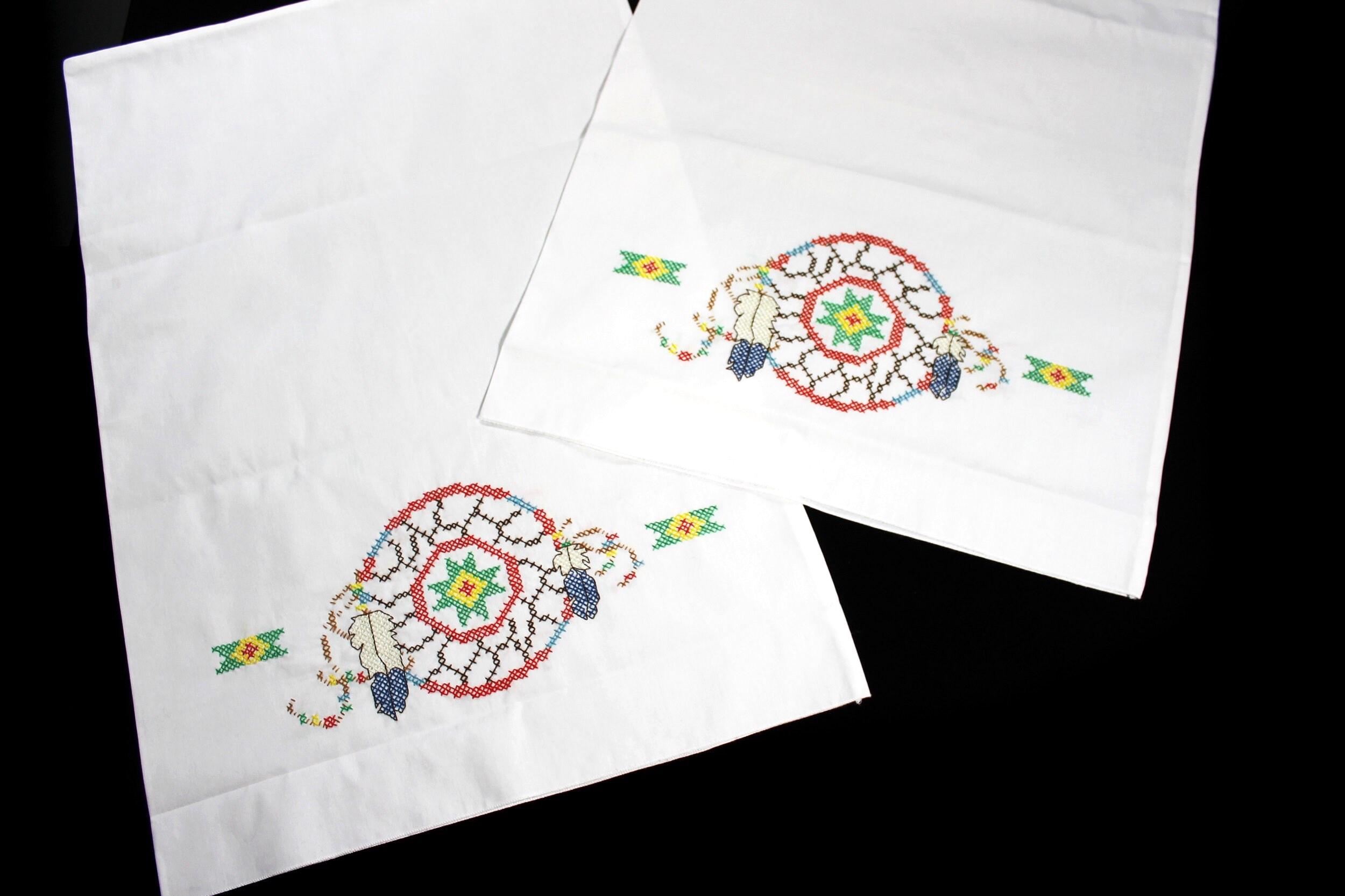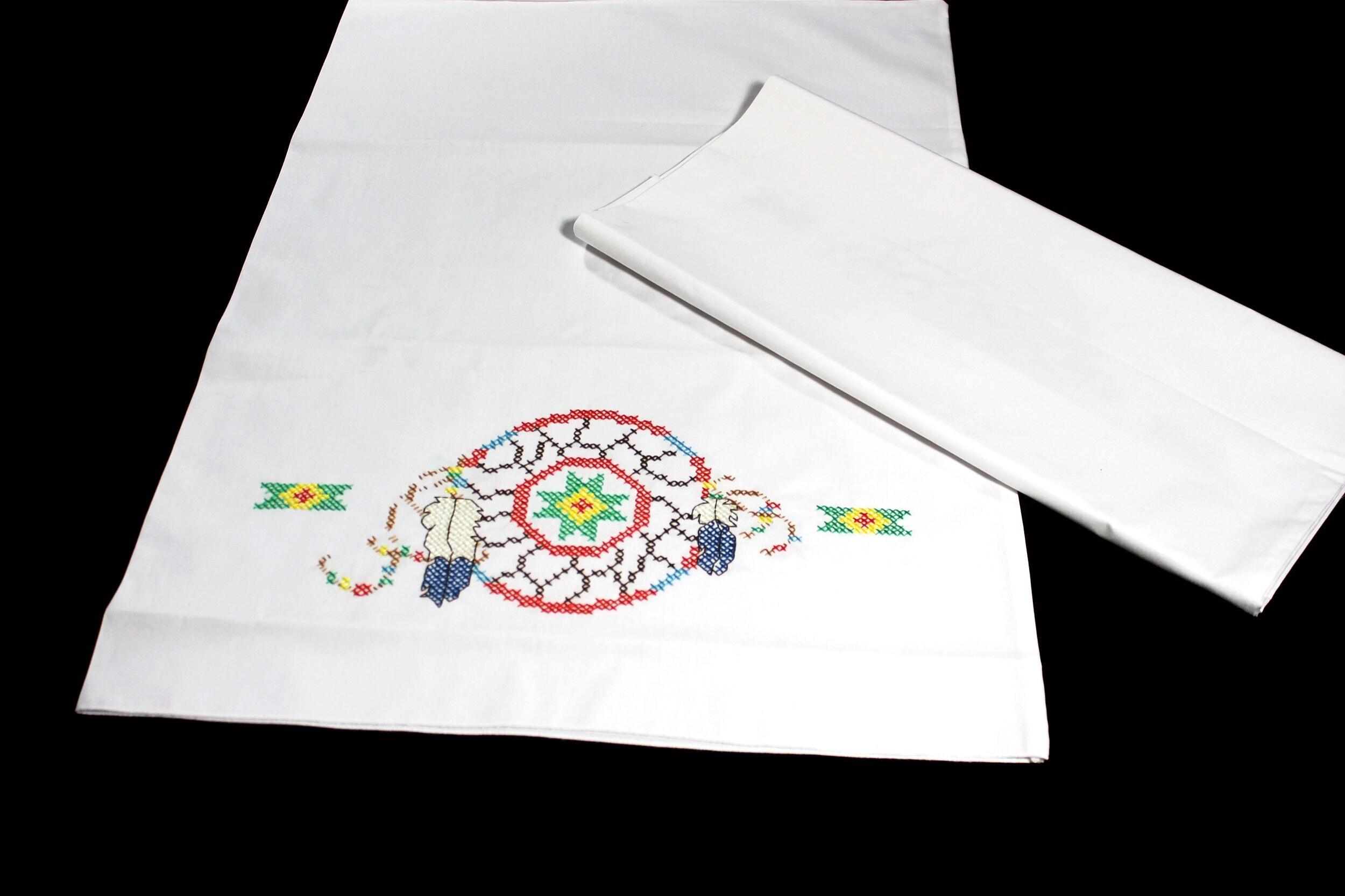 These pillowcases were made the old-fashioned way — one careful stitch at a time. This matching set of two handmade pillowcases features a dreamcatcher design worked in cross stitch embroidery across crisp white fabric. The colorful stitching creates a warm Southwestern feel while still keeping the overall look calm and welcoming. Each case carries the quiet character that only hand embroidery brings. No machines, no shortcuts — just patient needlework meant to be used and enjoyed every day. They’re perfect for adding handmade comfort to a bedroom, guest room, camp, or cozy retreat space. The design adds personality without overpowering the room, making them easy to blend with rustic, farmhouse, or Southwestern décor. These are the kinds of linens that make a bed feel thoughtfully prepared.