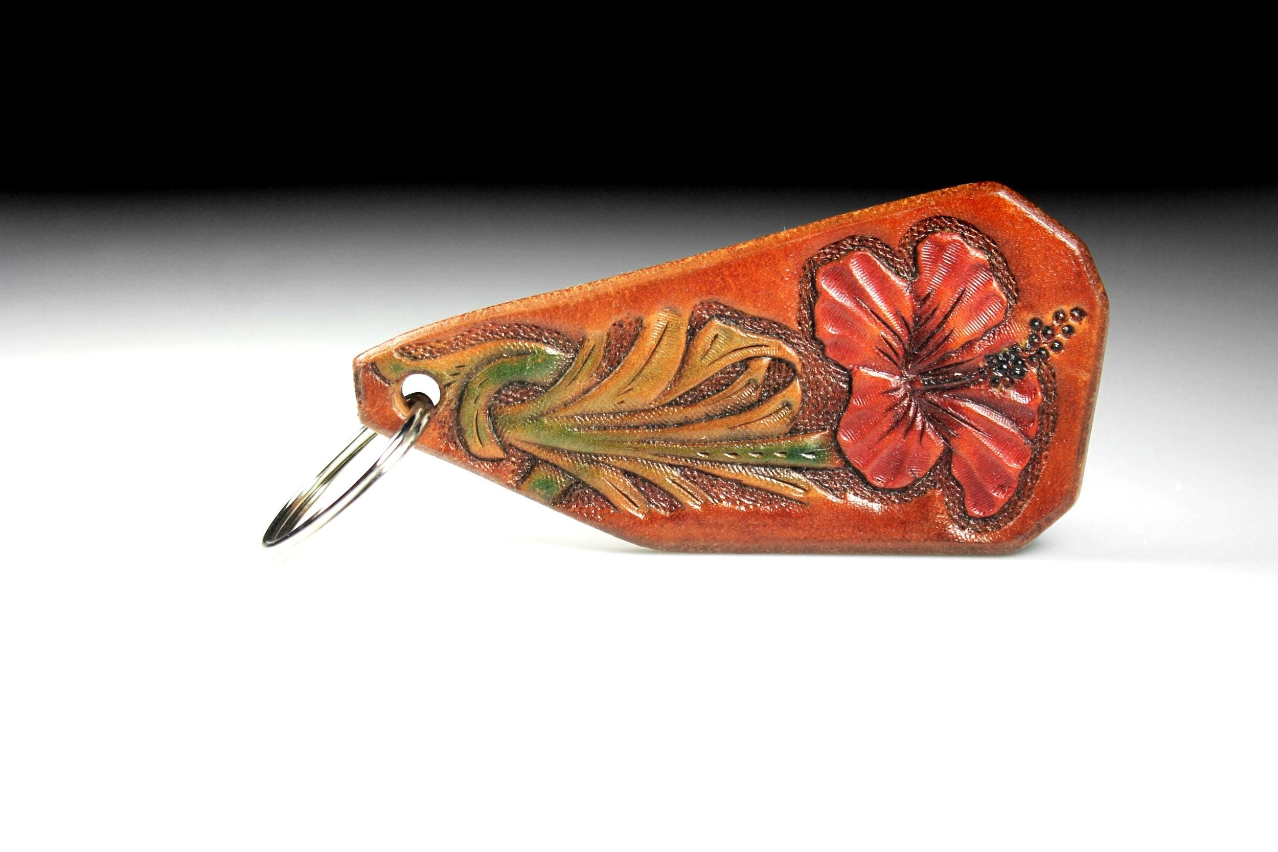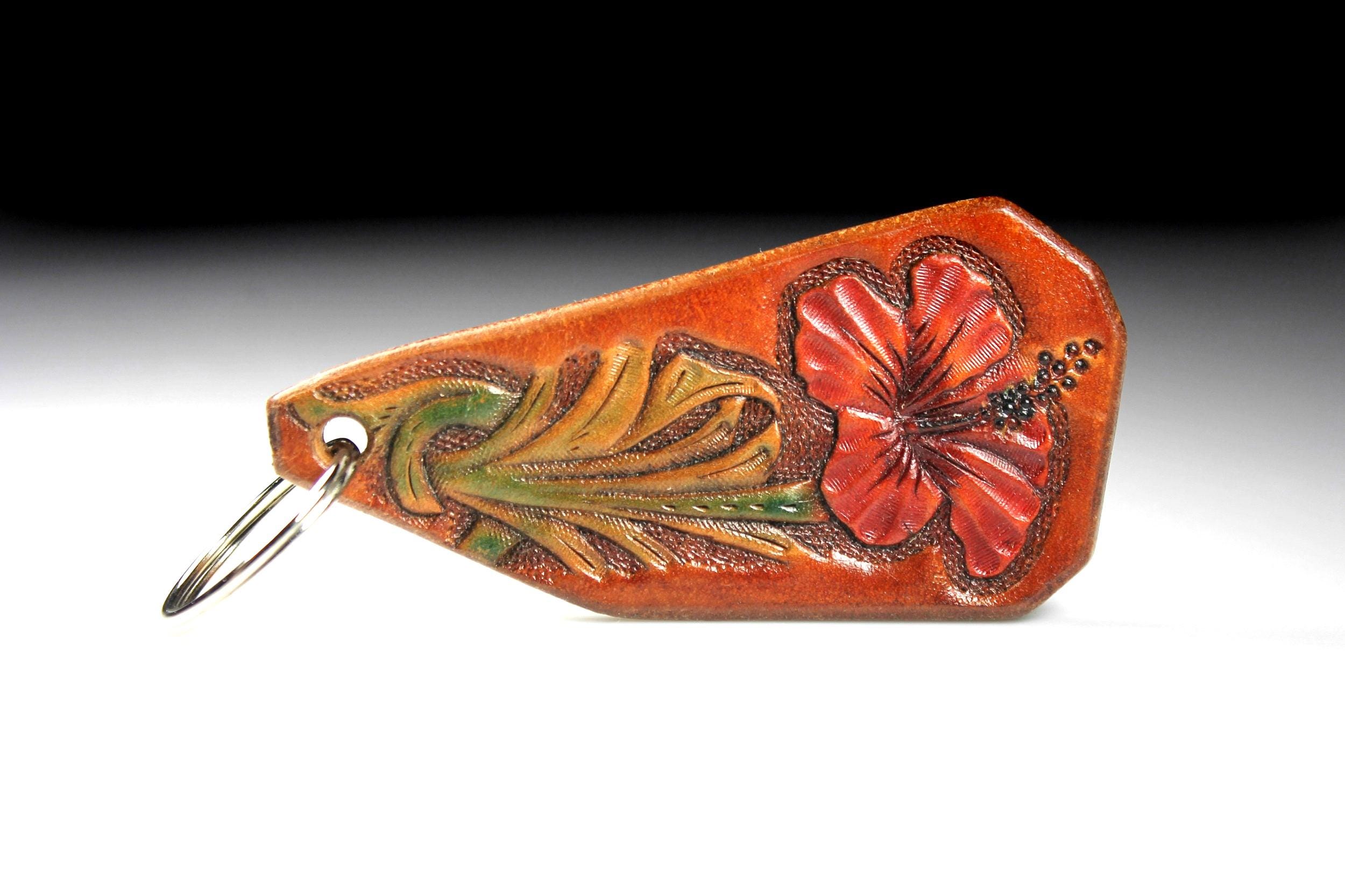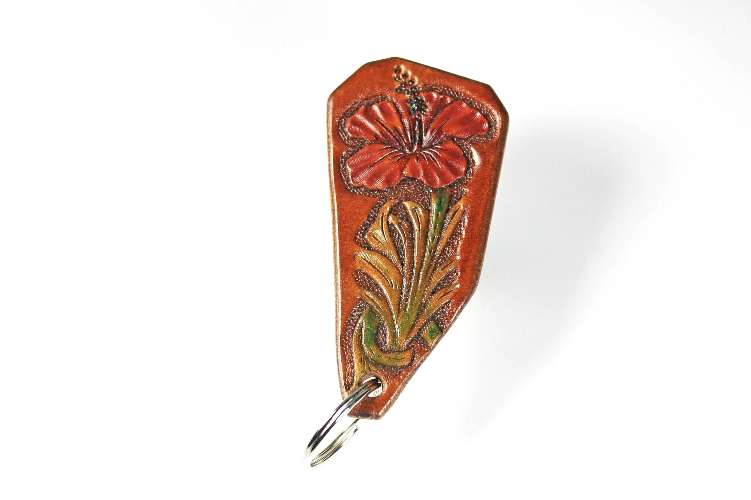 A gorgeous keychain hand tooled and made from 100 percent leather. The flower color is a lovely red with green leaves on a brown background. This gorgeous key fob is handmade from 13 oz. saddle skirting leather. After tooling the flower, the fob's edges are beveled, then burnished to golden perfection then oiled for longevity and suppleness. This could also be used as a zipper pull (leather will not scratch bags as beads and metal pulls do). A great addition to any purse or bag. A great gift idea for friends or family.