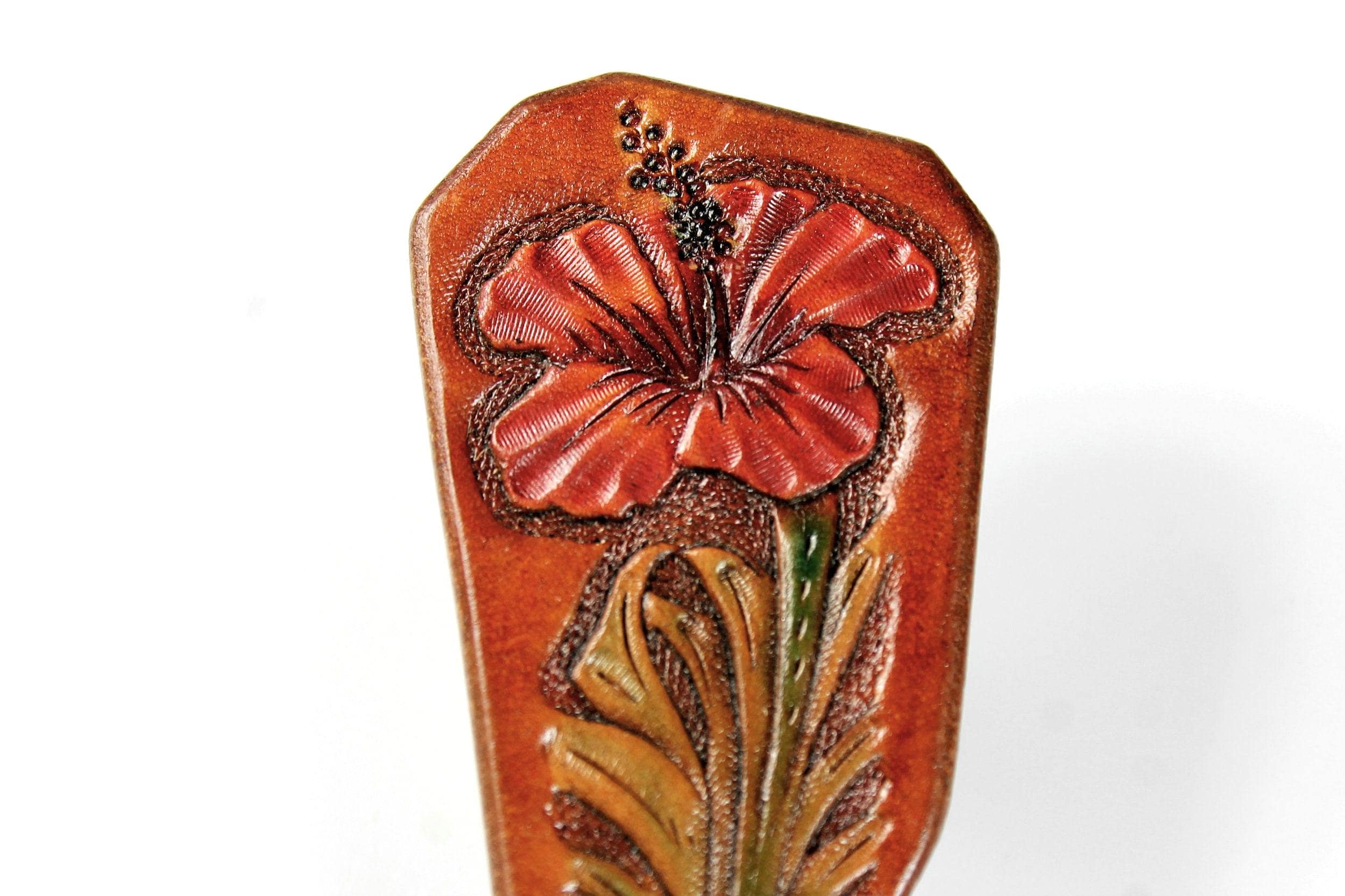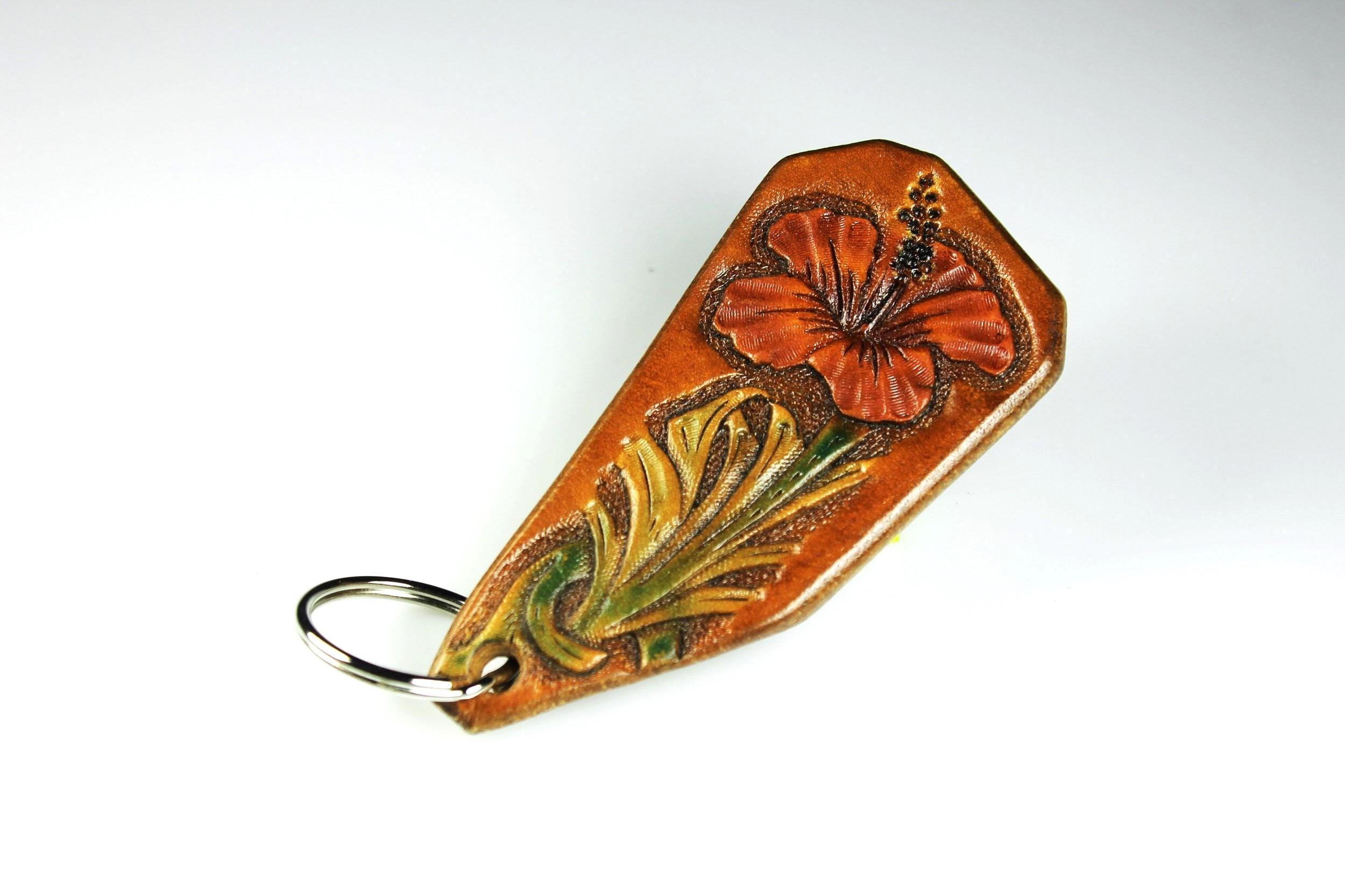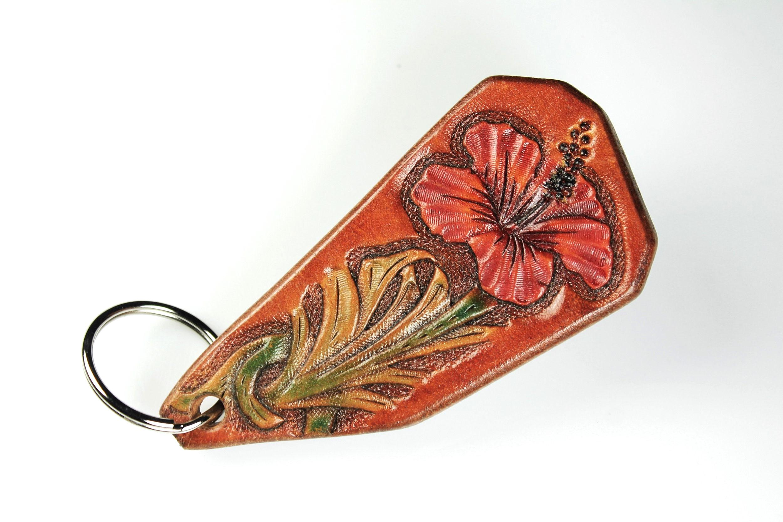 A gorgeous keychain hand tooled and made from 100 percent leather. The flower color is a lovely red with green leaves on a brown background. This gorgeous key fob is handmade from 13 oz. saddle skirting leather. After tooling the flower, the fob's edges are beveled, then burnished to golden perfection then oiled for longevity and suppleness. This could also be used as a zipper pull (leather will not scratch bags as beads and metal pulls do). A great addition to any purse or bag. A great gift idea for friends or family.